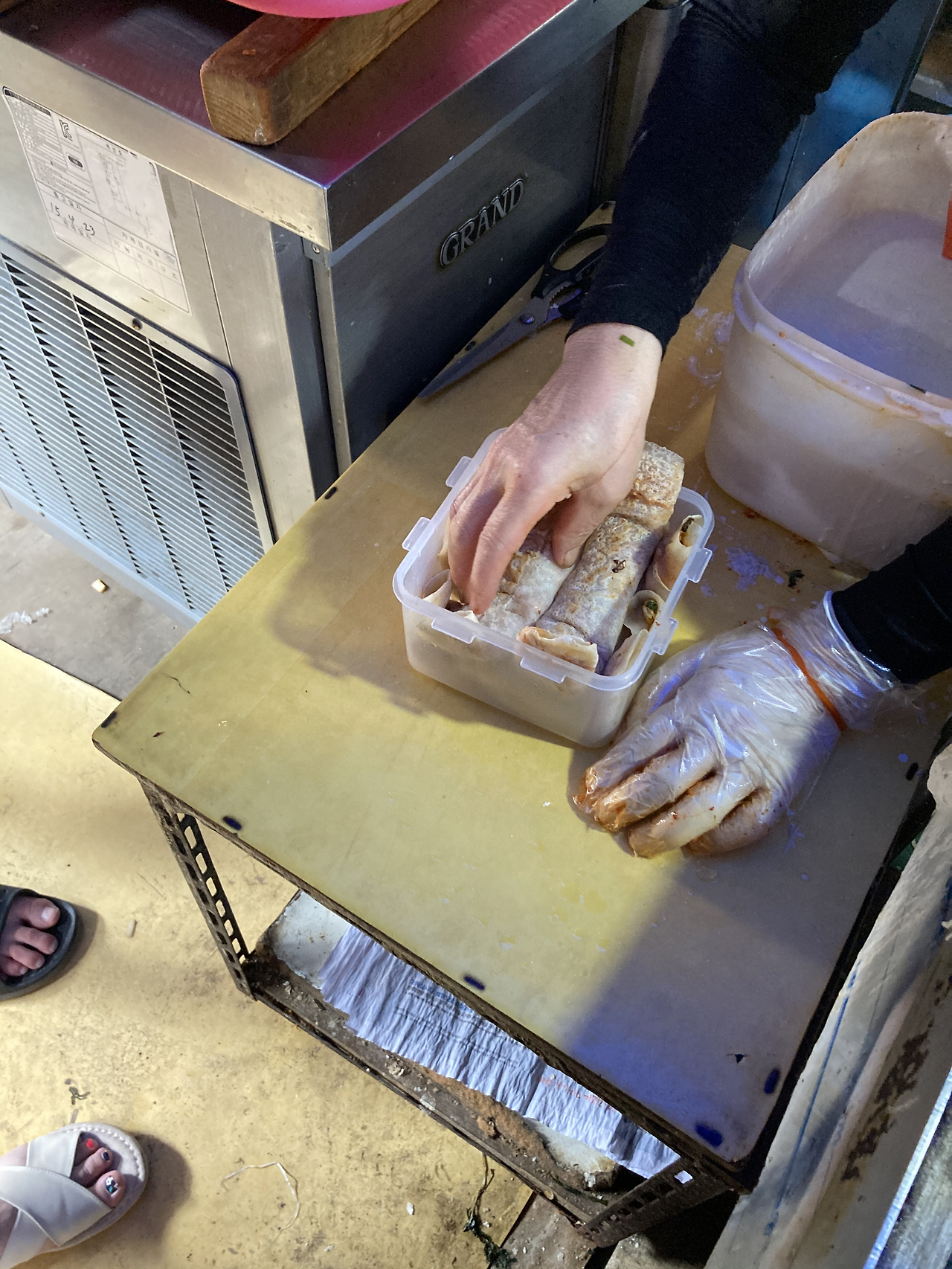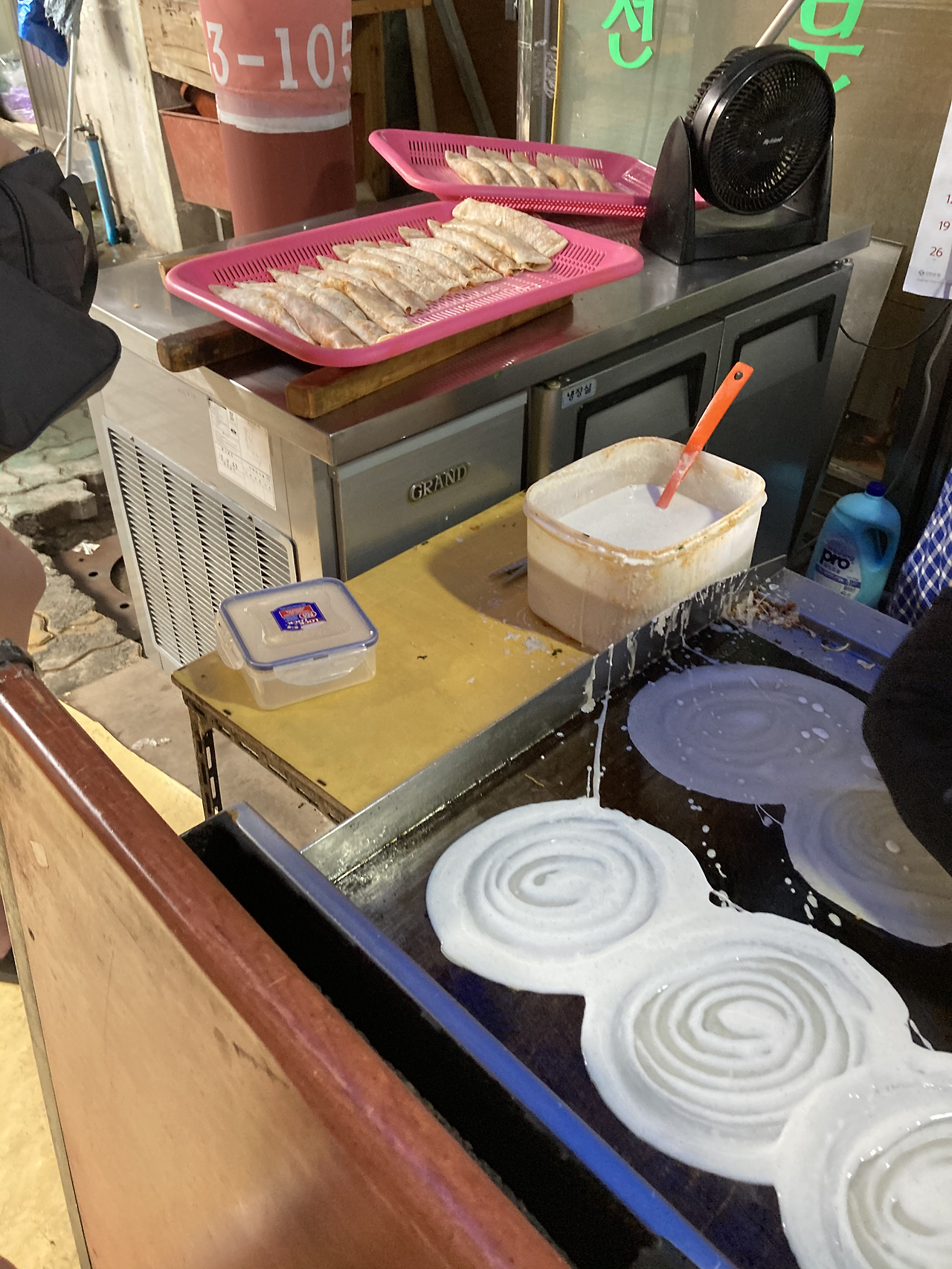정육점과 야채가게에서의 승리에 도취된 우리, 긴장이 풀렸는지 허기가 몰려왔다. 마침 온갖 주전부리 냄새가 솔솔 풍겨온다. 이 맛에 전통시장 가는 거 아닙니까! 강원도에 온 것을 실감하게 하는 감자떡과 메밀 전병이 따끈따끈하게 우릴 기다리고 있었다. 약올리듯 깔끔한 비닐포장 안에서. 아니, 분명 여기서 만든 걸텐데 너네 왜 포장되어 있는 거냐!