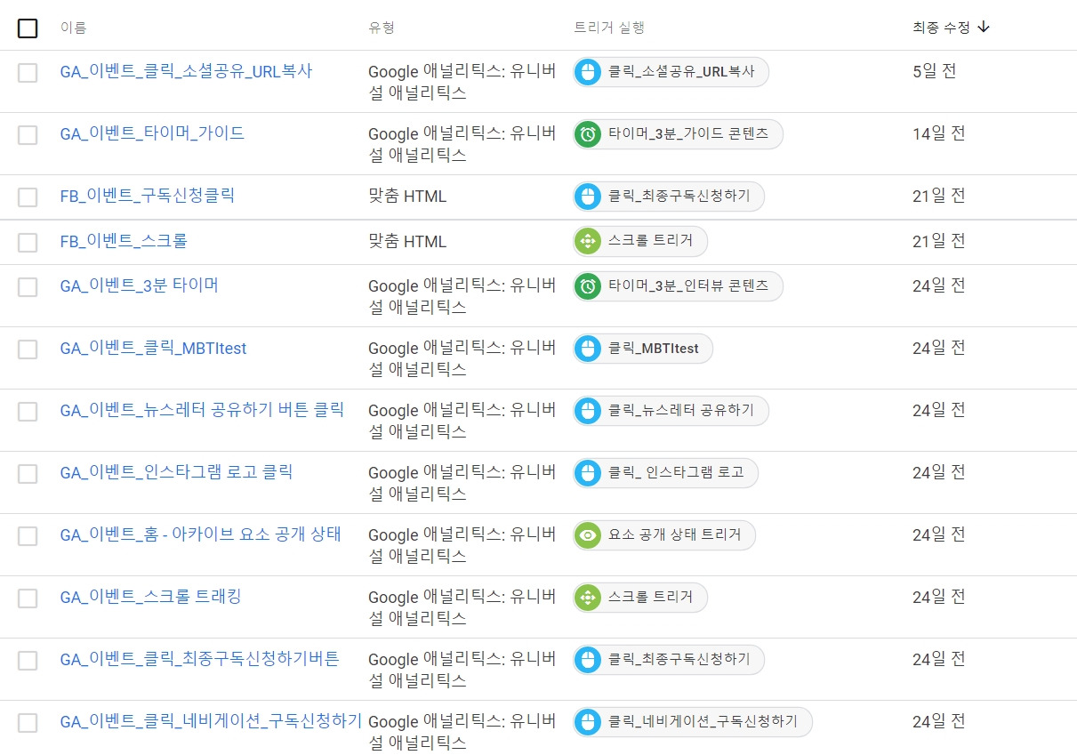 Google Tag Manager를 통해 전송된 행동 정보를 Event라고 한다. Event는 일종의 센서 같은 것으로 고객이 특정 행동을 했을 때 신호가 발송된다. 이제 우리는 어디에 센서를 달 것인지(어떤 행동을 추적할 것인지)를 정해야 한다.