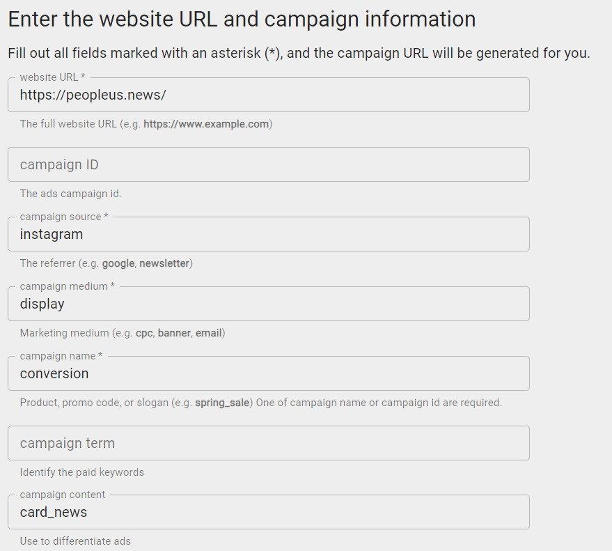 초대장에 기입해야 하는 정보는 URL, source, medium, campaign name, term, content 5가지로, 이 중 마지막 두 가지는 필수 사항은 아니다.