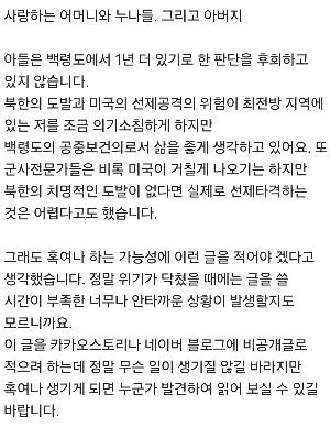 제가 있던 2016~2018년에는 북한의 핵보유로 서방과 북한의 긴장이 심해지던 시기였고 북한이 ICBM(대륙간 탄도 미사일)으로 괌 앞바다에 시험사격을 한다고 했을 때는 미국의 핵잠수함이 백령도 앞바다까지 들어왔습니다. ICBM 이 뜨는 즉시 핵잠수함으로 북한을 총공격한다며 백령도 바다에서 진을 쳤던 시기라 모두가 불안해하던 시기이기도 합니다. 저도 그때 혹시나 하는 마음에 쓴 유서가 아직 남아있습니다.