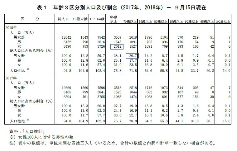 총인구 대비 70세 이상은 20.7%, 65세 이상은 28.1%를 나타내고 있다.