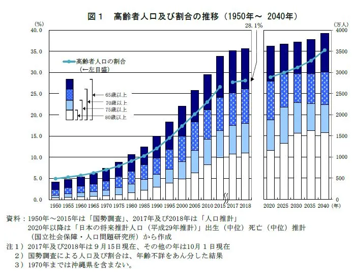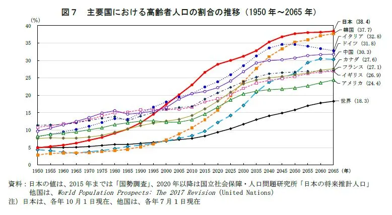 국제비교이다. 한국은 2020년에 16% 정도가 예측되고, 2040년에는 31% 정도가 예상된다. 아울러 2060년에는 33% 정도가 예측된다고 한다. 일본 정부의 예측은 아니고, World Population Prospects: The 2017 Revision(United Nation)을 참고한 자료라고 한다.