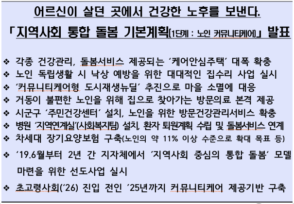 정부는 지난 2018. 11. 20. 어르신이 살던 곳에서 건강한 노후를 보내도록 돕기 위해 '지역사회 통합 돌봄계획(1단계: 노인 커뮤니티케어)'를 발표했다.