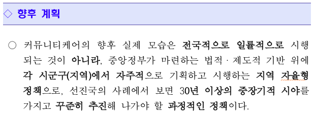커뮤니티케어도 지역밀착을 강조하기 때문에 결국은 주민이 주체가 되는 모델이 이상적인데, 그것을 우리에 맞게 준비해야 한다. 주민들이 그런역할 해야한다.