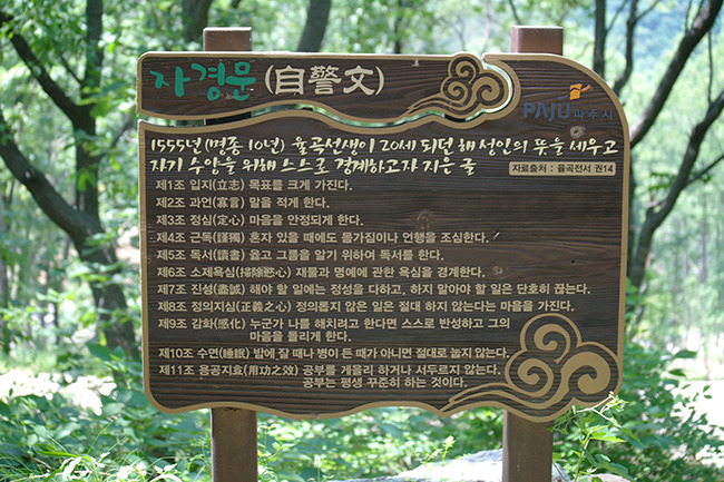 자경문은 스스로를 경계하는 글로 율곡 이이 선생님께서 20세가 되던 해 어머니인 신사임당의 3년 상을 마치고 금강산에서 하산하며 지은 글이라고 한다.