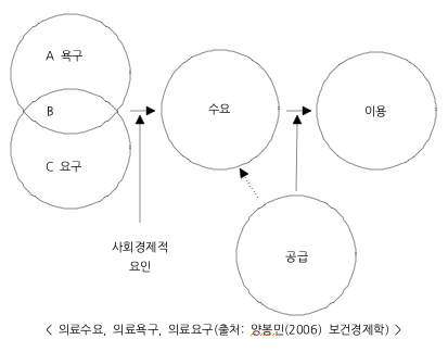 일단 형성된 의료수요는 의료공급과 만나 마침내 의료이용으로 나타난다. 그런데 소비자 무지와 같은 의료서비스의 특성 때문에 공급자가 의료수요에 영향을 미칠 수가 있으며(점선부분) 만일 공급자가 수입을 증가시킬 목적으로 필요 이상의 의료서비스를 소비자로 하여금 수요하게 한다면 수요는 의료요구나 의료욕구보다 훨씬 더 클수도 있다. 따라서 요구나 욕구가 수요를 포함한다든지 혹은 그 반대로 수요가 요구나 욕구를 포함한다고 일률적으로 얘기하기는 어렵다.