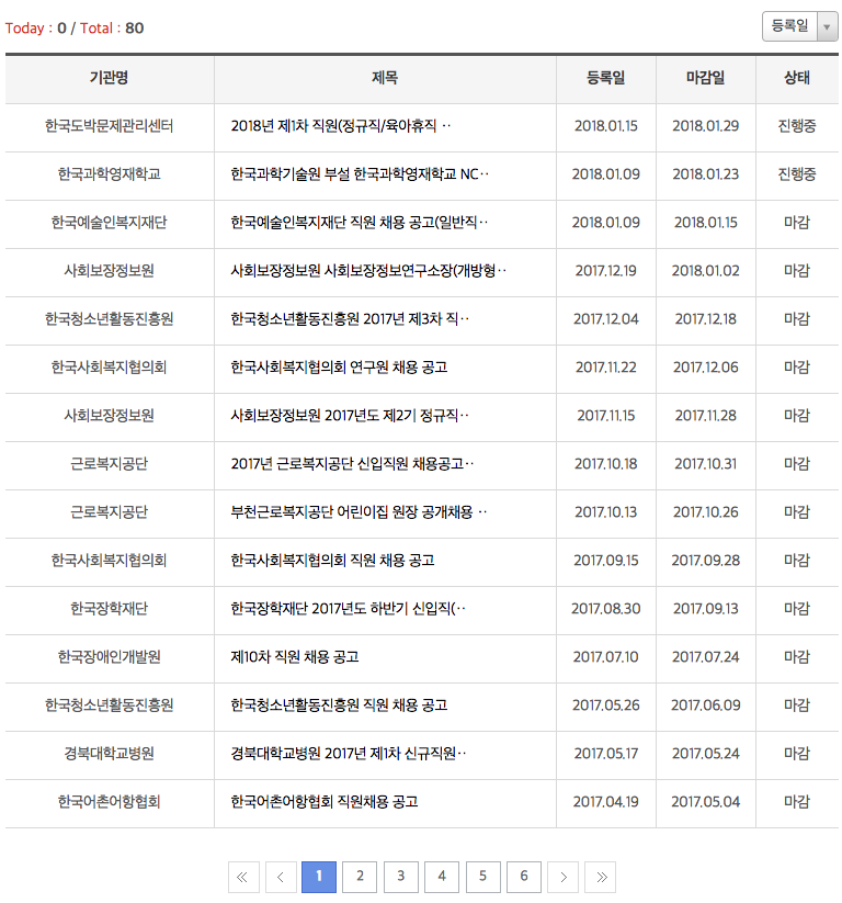 위 사진은 사회복지와 정규직으로 필터링한 채용공고이다.