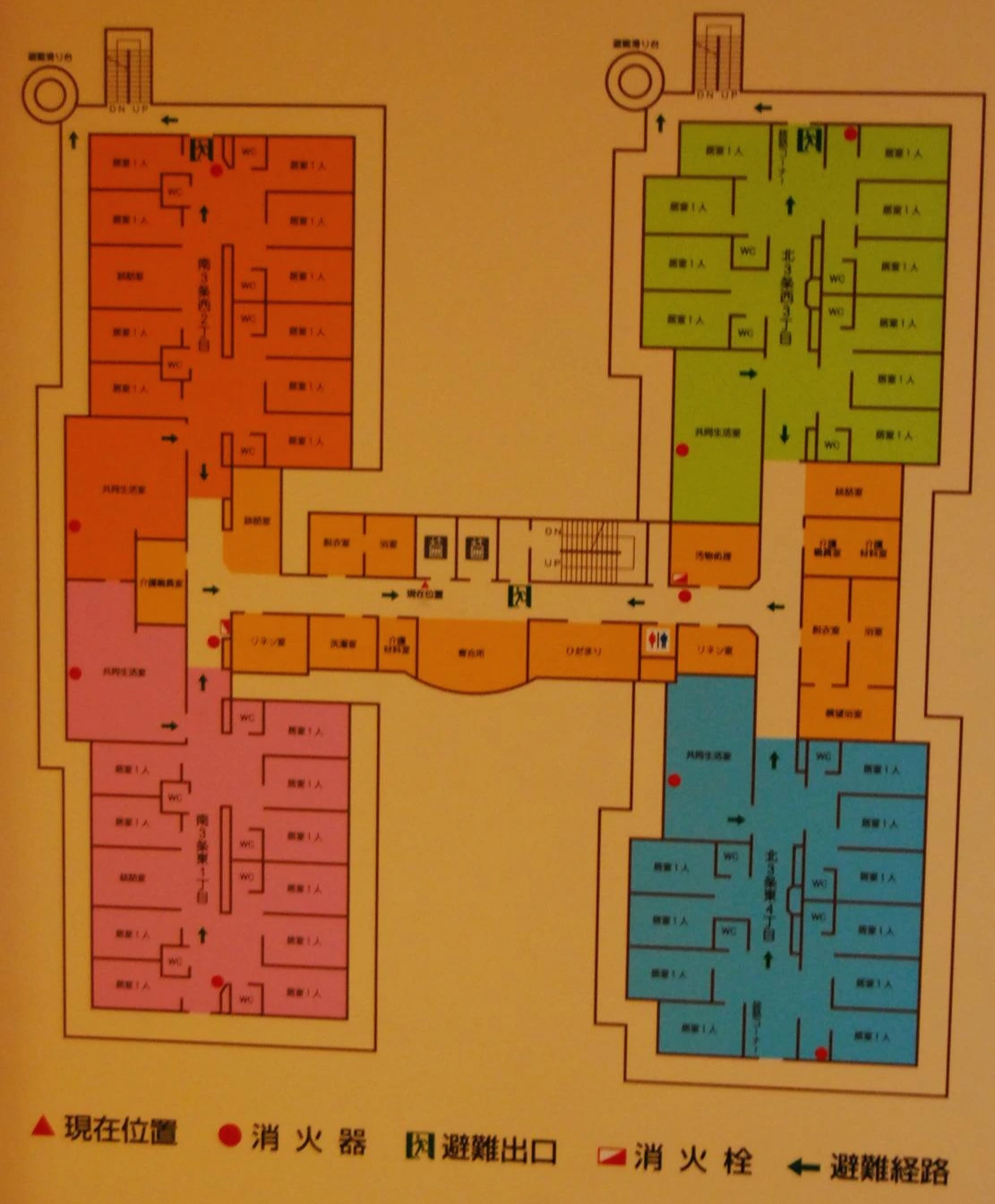 일본의 요양병원과 노인요양시설의 경우 방마다 탈출경로가 확보되어 있가. 방을 통해 테라스로 나오면 각 층의 한쪽 끝으로 가면 윗층에서 1층으로 탈출하는 슬라이드 탈출로가 확보되어 있다.