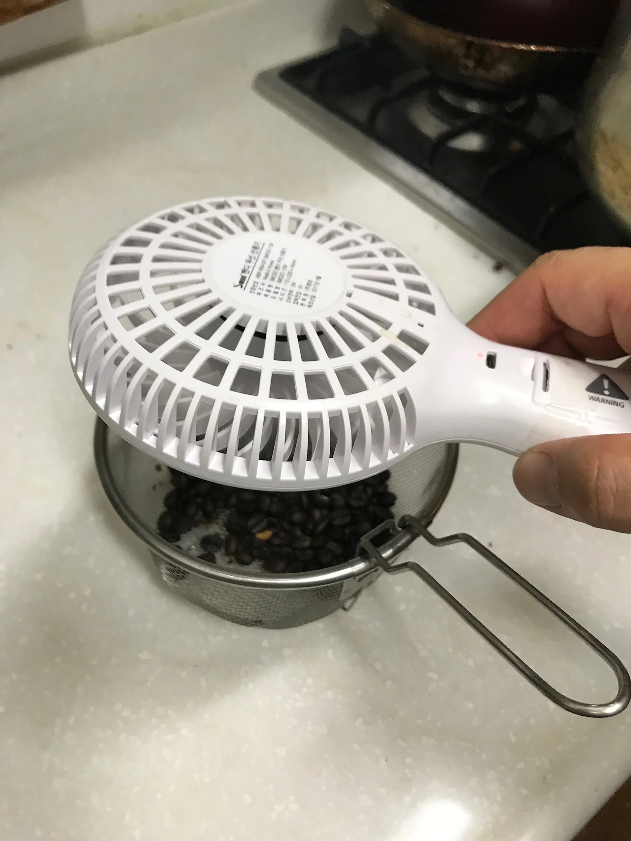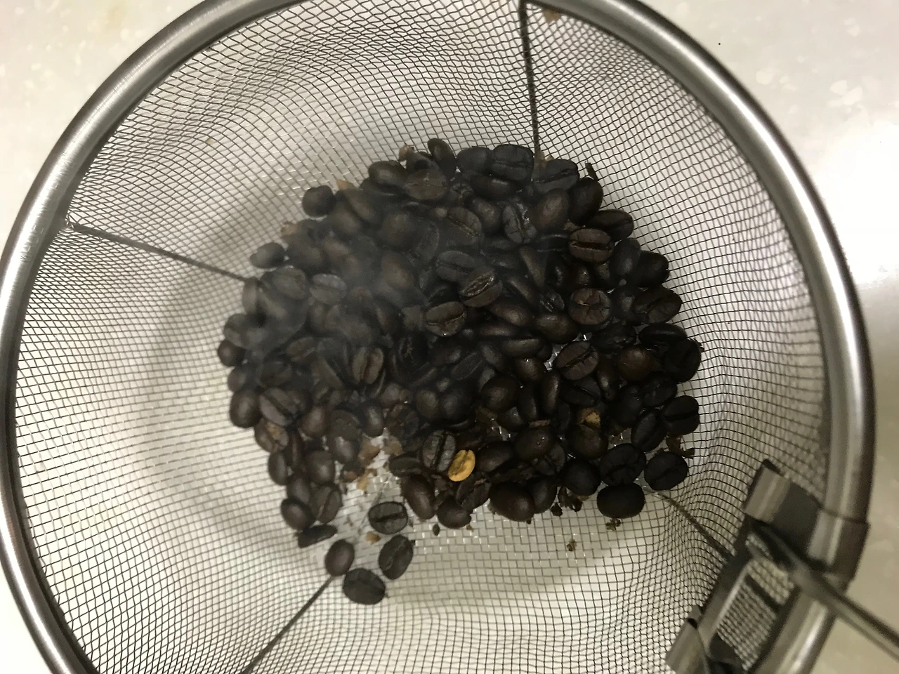 2차 크랙이 발생하는 것을 느끼자마자 빼버렸는데, 아주 까맣게 로스팅이 되었네요. 채반으로 내려서 바로 헨디 선풍기로 쿨링을 합니다. 좀 지저분하게 나와서 사진을 올리진 않지만, 청소를 원활하게 하기 위해서 싱크대에서 왼손으로 채반을 흔들고 오른쪽으로 채반 아래에서 선풍기로 쿨링을 했었죠.