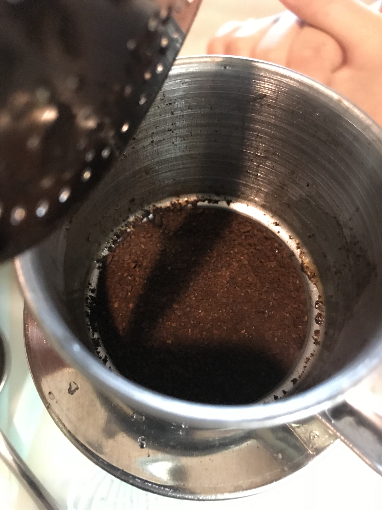 커피를 티스푼으로 3스푼 정도 올리고, 살짝 흔들어 수평을 맞춘 뒤, 구멍난 철판으로 꼭꼭 눌러준다.