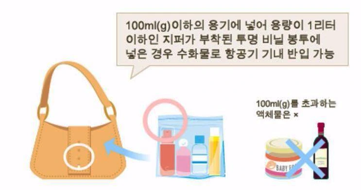 - 지퍼팩에 넣을 수 있는 액체는 용기에 담긴 저용량 액체, 스프레이, 젤류이며 100ml 이하여야 한다.