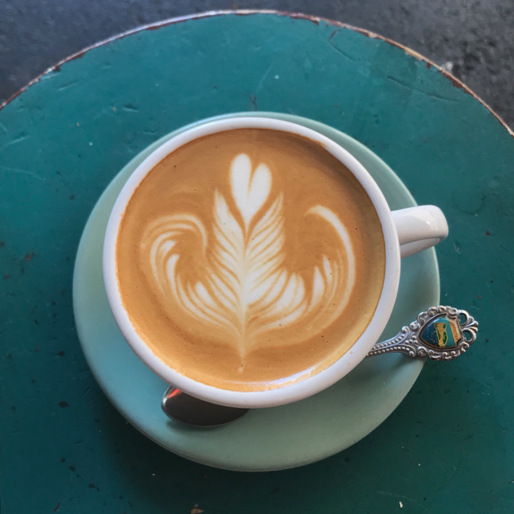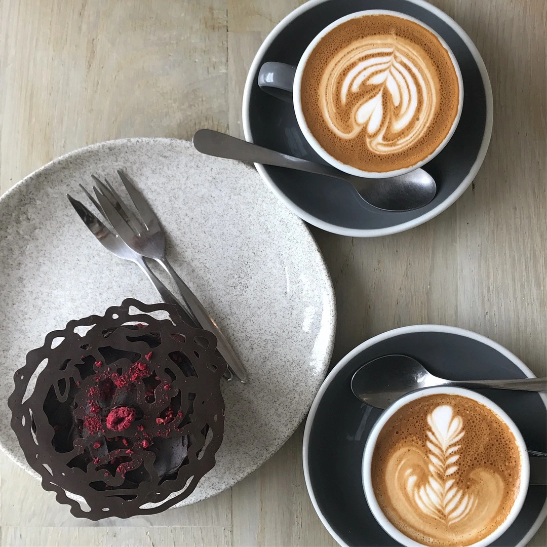 라즈베리 초콜릿 케이크는 왜 베이커리로 유명한지 체감하게 해주는 맛이었다. 중간중간에 가득 담긴 다크 초콜릿과 라즈베리를 한입에 먹을 때마다 감탄했다. 곧이어 주문한 라테 아트가 예쁘게 올라간 플랫화이트도 나온다.