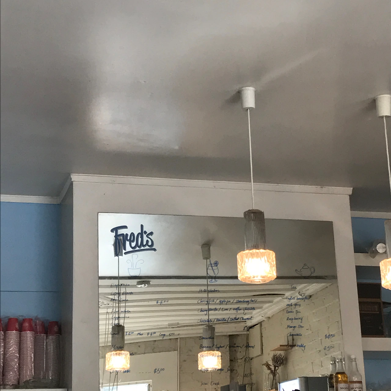 거울에 적어 내려간 'Fred's'의 메뉴들은 작은 손 그림과 함께다. 이 곳까지 걸어오느라 조금 더워진 뉴질랜드에 와서 처음으로 아이스커피를 먹어보기로 한다.
