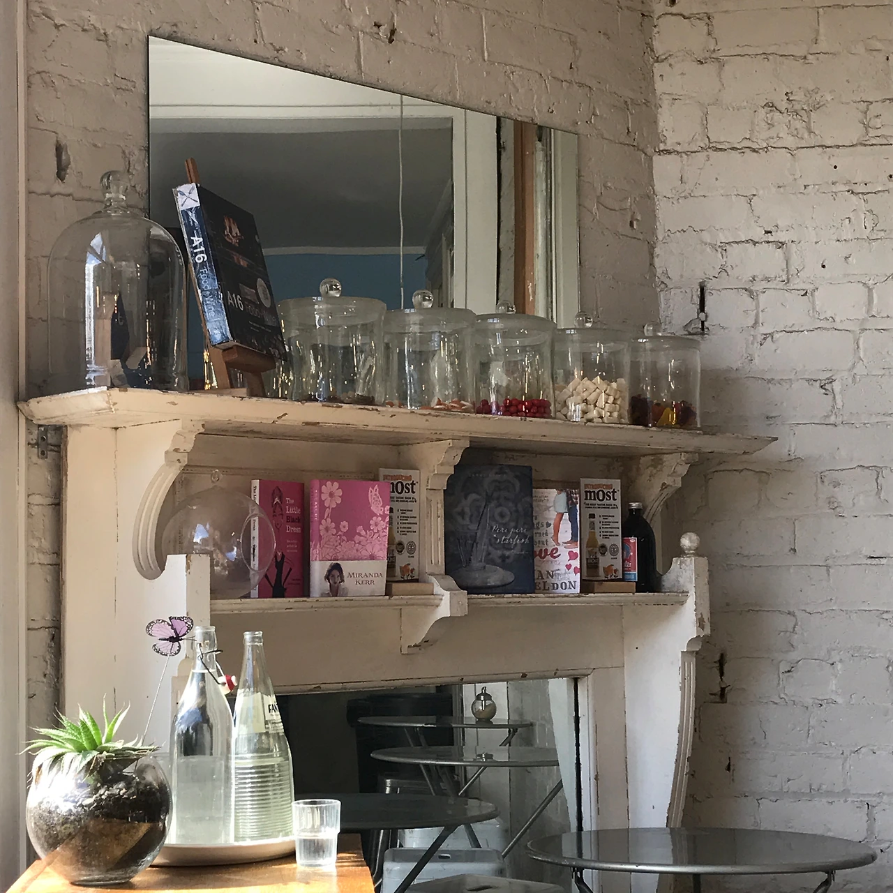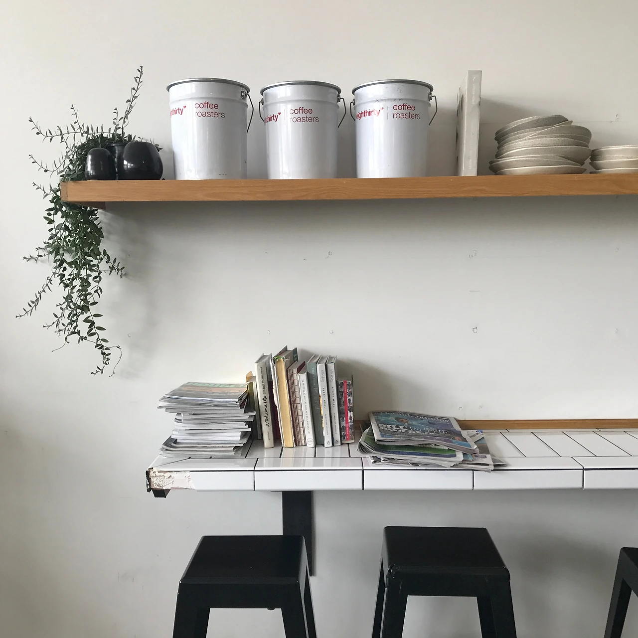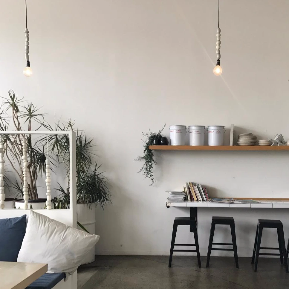하얀 벽돌로 된 벽에 하얀 장식장이 있는 이 스폿은 카페에 한참 머물고 싶게끔 만드는 장면이 아닐 수 없다.
