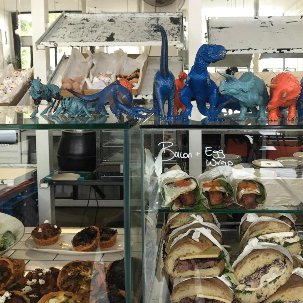 구경은 잠시 미뤄두고, 유명한 디저트 베이커리로 눈길을 돌려본다. 베이커리 위에는 단색의 공룡 피규어들이 놓여 있다.
