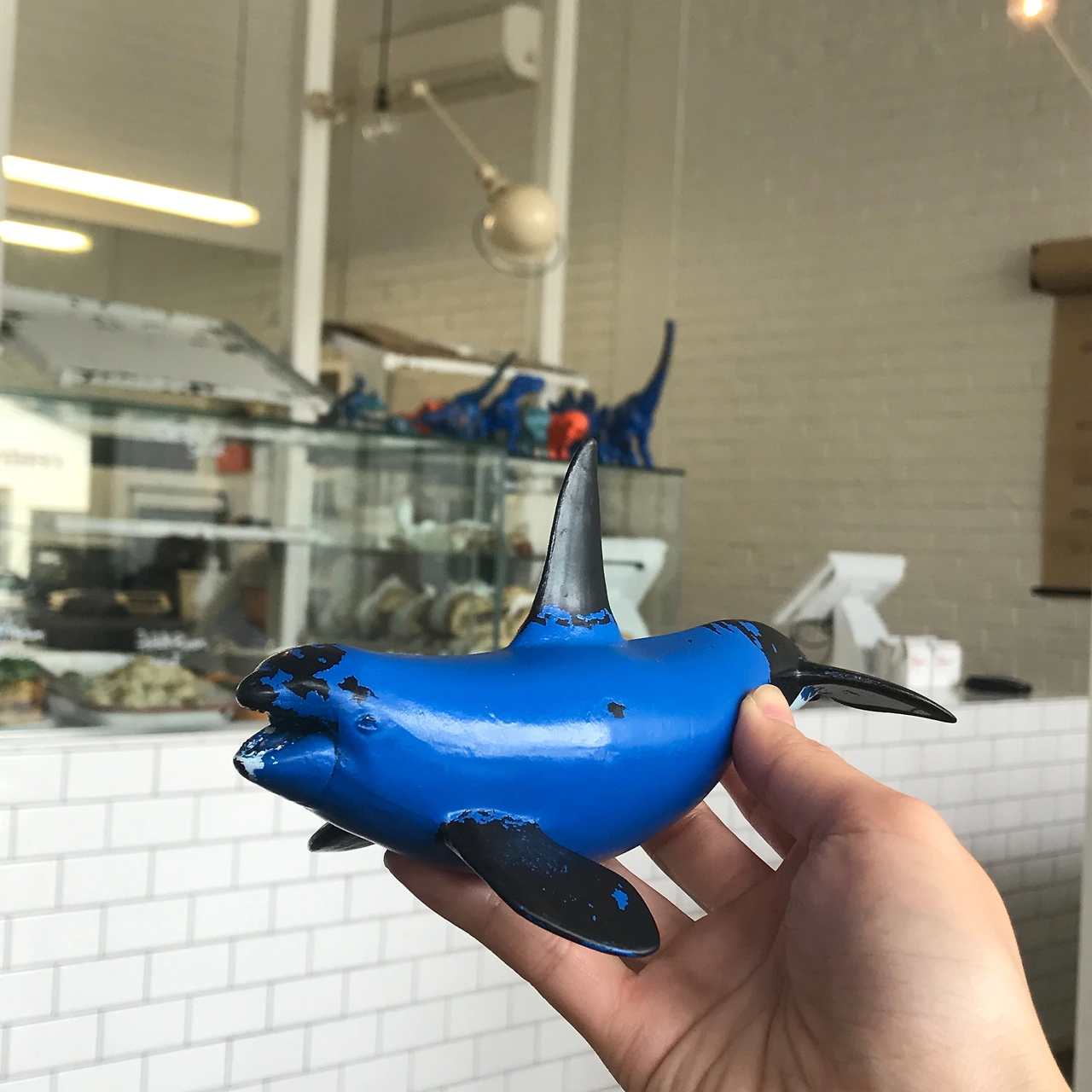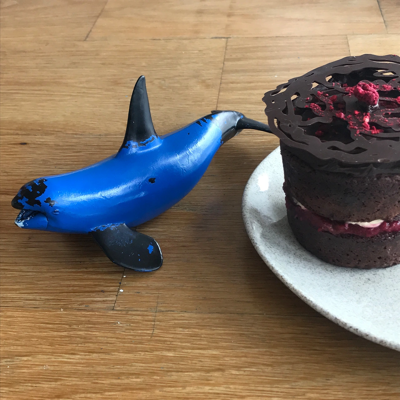 주문한 라즈베리 초콜릿 케이크가 먼저 나오면서 플랫화이트를 위한 'have here number'를 주는데, 귀엽다. 번호표가 아니라, '돌고래' 피규어다. 그제야 주변 테이블을 보니, 각자 다른 동물들이 귀엽게 놓여 커피를 기다리고 있다. 그중에서도 제일 좋아하는 고래 피규어라니 기분이 좋다.