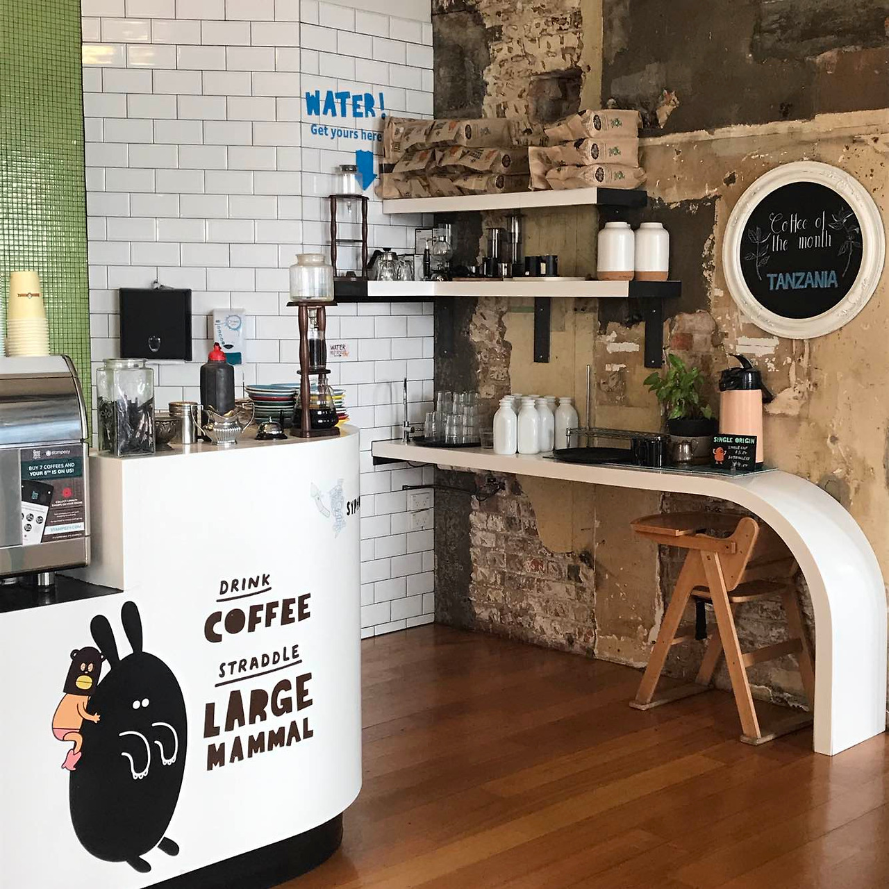 널찍한 공간을 모두 잘 활용한 예들이 많다. 이 달의 원두를 소개한 곳과 셀프 바도 깔끔하게 한쪽에 비치되어 있고, 커피 머신을 올려둔 선반에는 카페 고유의 귀여운 캐릭터가 그려져 있다.