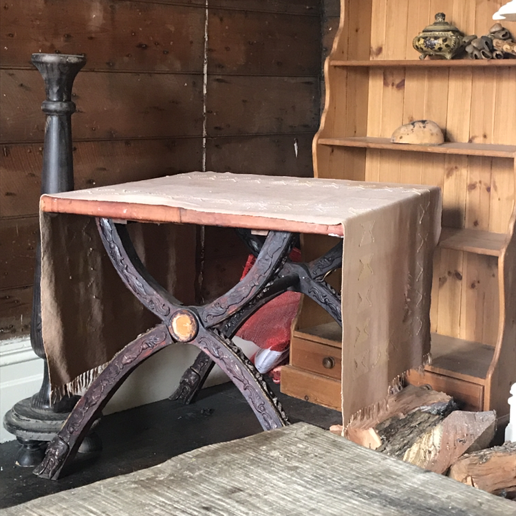 하얀 벽에 파란 테이블, 그 위에 작은 원목 선반.