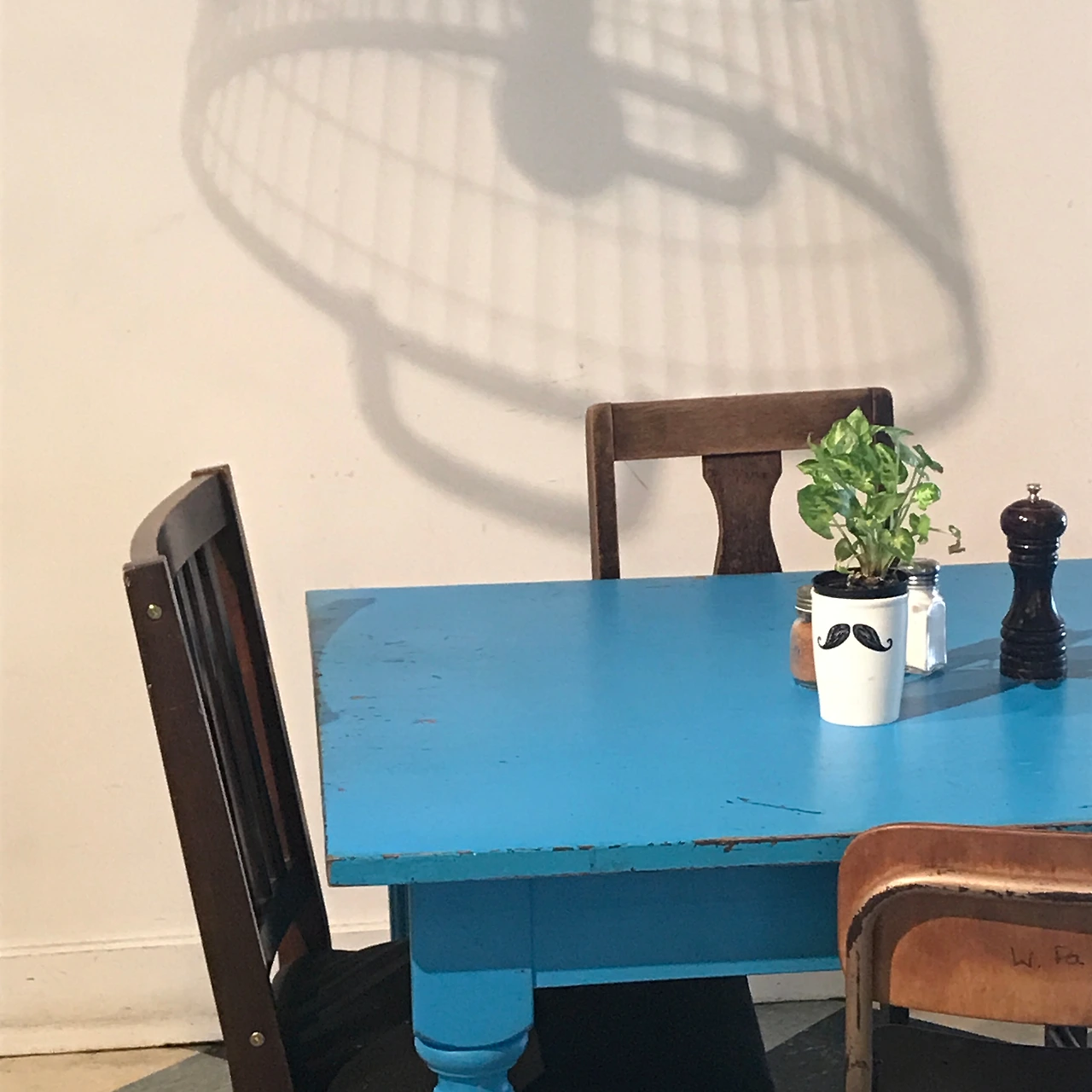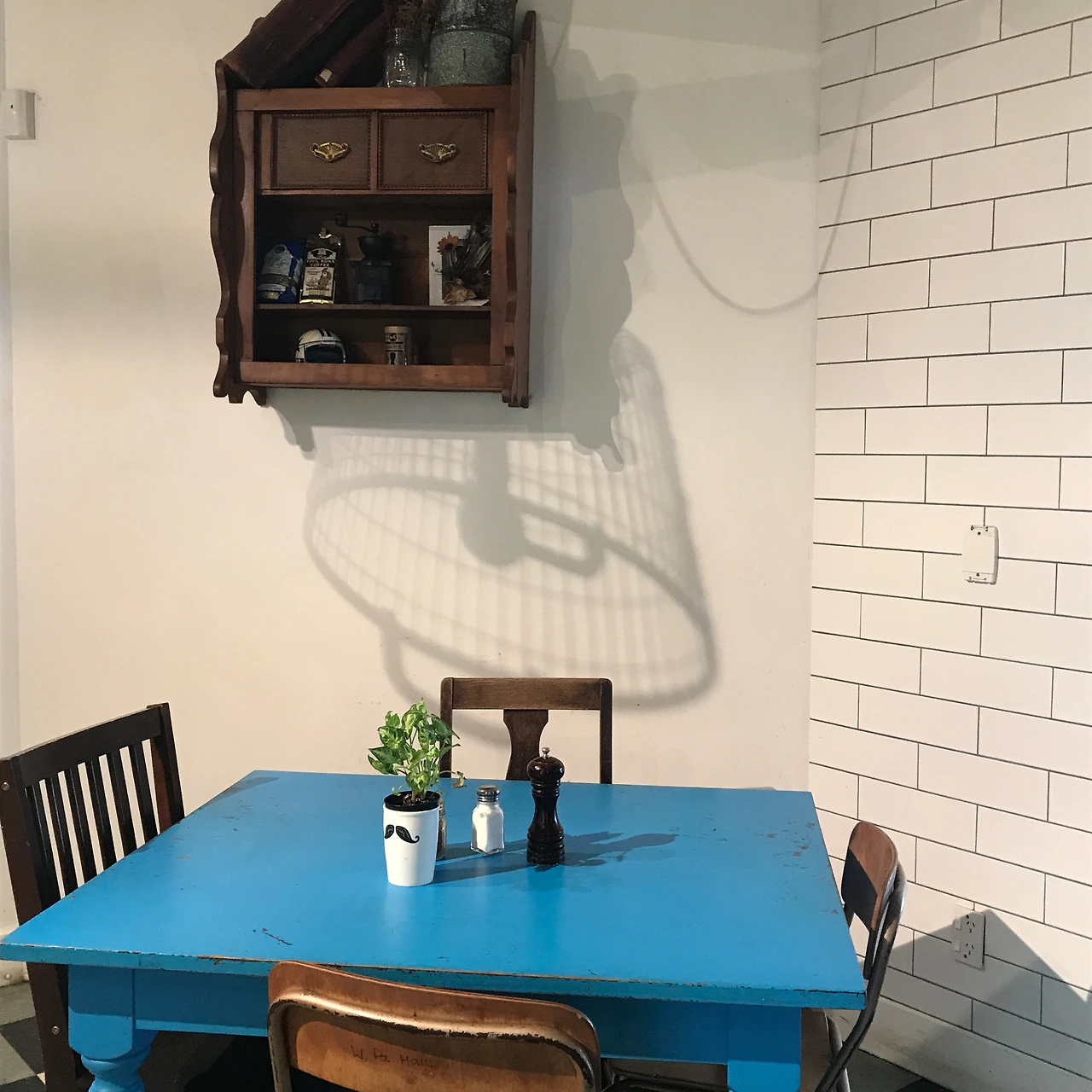 들어서자마자 길게 놓인 큰 원목 테이블과 천장에서 내려오는 큰 전구들이 눈에 띈다. 시멘트 바른 벽을 그대로 둔 쪽에는 귀여운 민트색 원목 테이블이 있다.