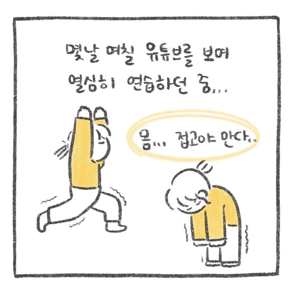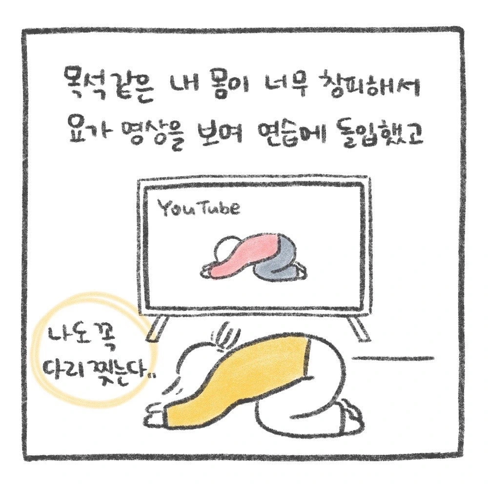 더 이상 이렇게 살면 저체력으로 죽겠다 싶어 요가를 배우기 시작한 지도 두 달이 다 되어간다. 처음 시작했을 때 손으로 땅 짚기는커녕 바르게 앉는 자세도 힘들 만큼 뻣뻣했던 나. 다른 사람들은 능숙하게 따라 하는 동작도 되질 않았고 목석같은 내 몸뚱이가 너무 창피했다...... 나도 꼭 다리를 쫙 찢으리라는 일념 하에 유튜브를 뒤져 요가 영상을 보며 연습에 돌입했다.