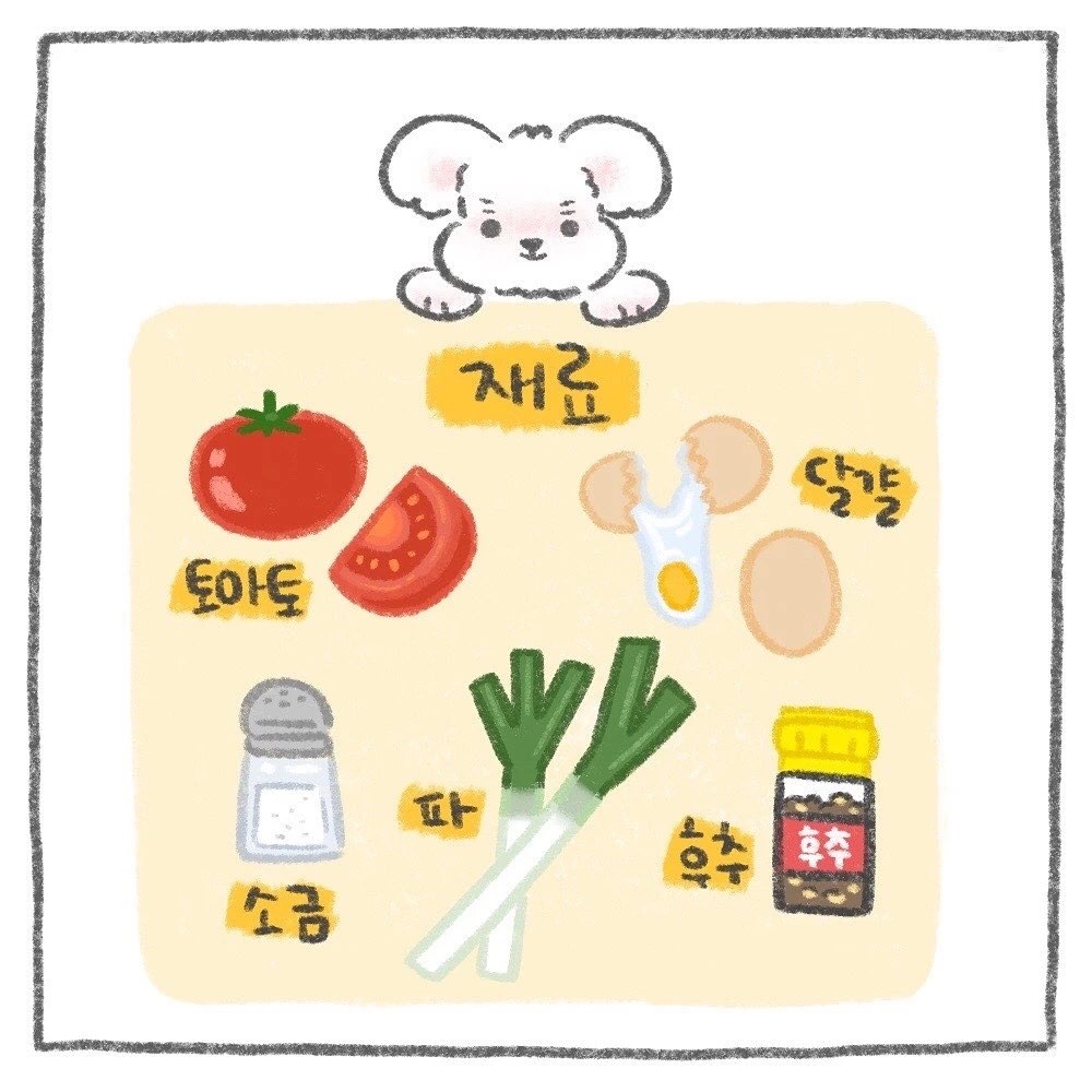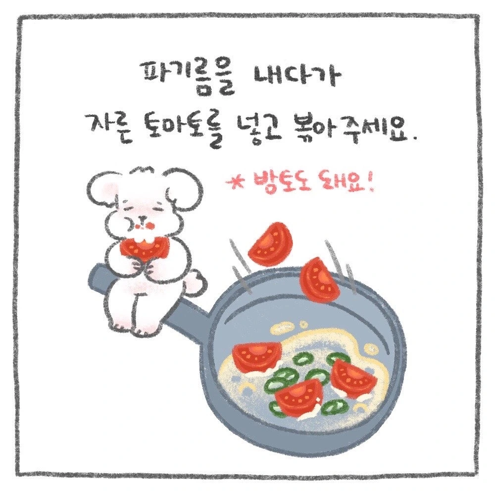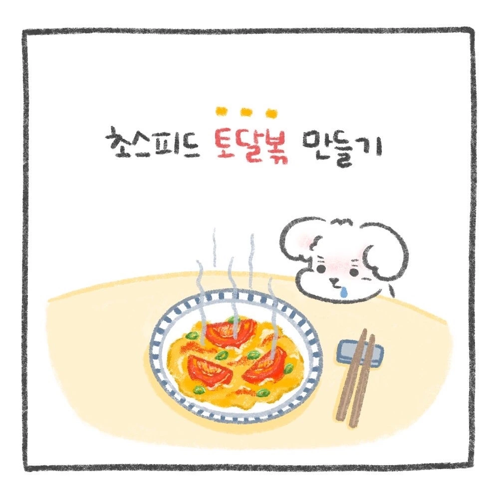 주말 아침 휘리릭 만들 수 있는 초간단, 초스피드 토마토 달걀 볶음, 일명 '토달볶' 만들기 레시피입니다. 어디선가 보고 만들어 먹어봤는데 저 같은 요알못도 쉽고 맛있게 만들 수 음식이라서 레시피로 그려봤어요! 이번 주말에 꼭 도전해보세요 :)