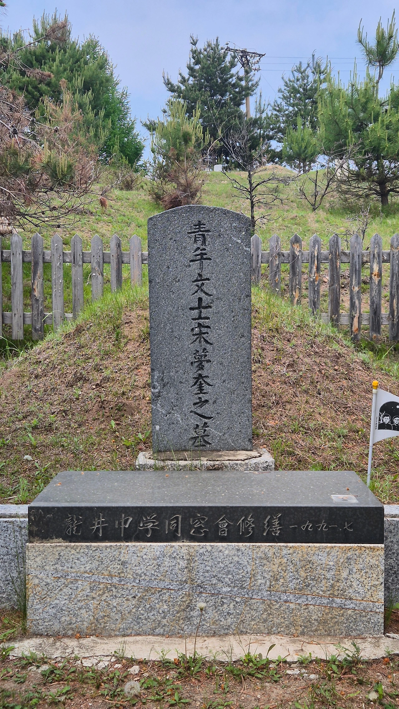 나무테두리를 한 윤동주묘비가 보이고 왼쪽 옆으로 2미터 정도 떨어진 곳에 송몽규 묘비도 있다