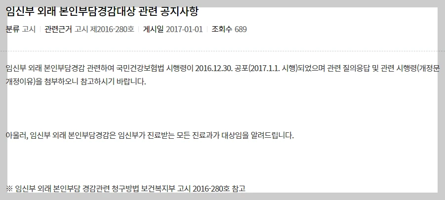 국민건강보험법 시행령(대통령령 제27734호)에 따라 2017년 1월 1일부터 모든 임산부는 외래 진료의 모든 진료과에서 급여비용의 본인부담률을 감면받을 수 있습니다.(비급여는 제외)