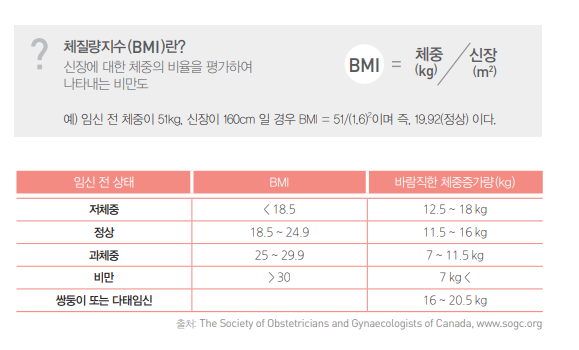- 임신을 준비하신다면 18.5≤BMI <25의 정상범위에 가깝게 체중을 조절해 주세요.