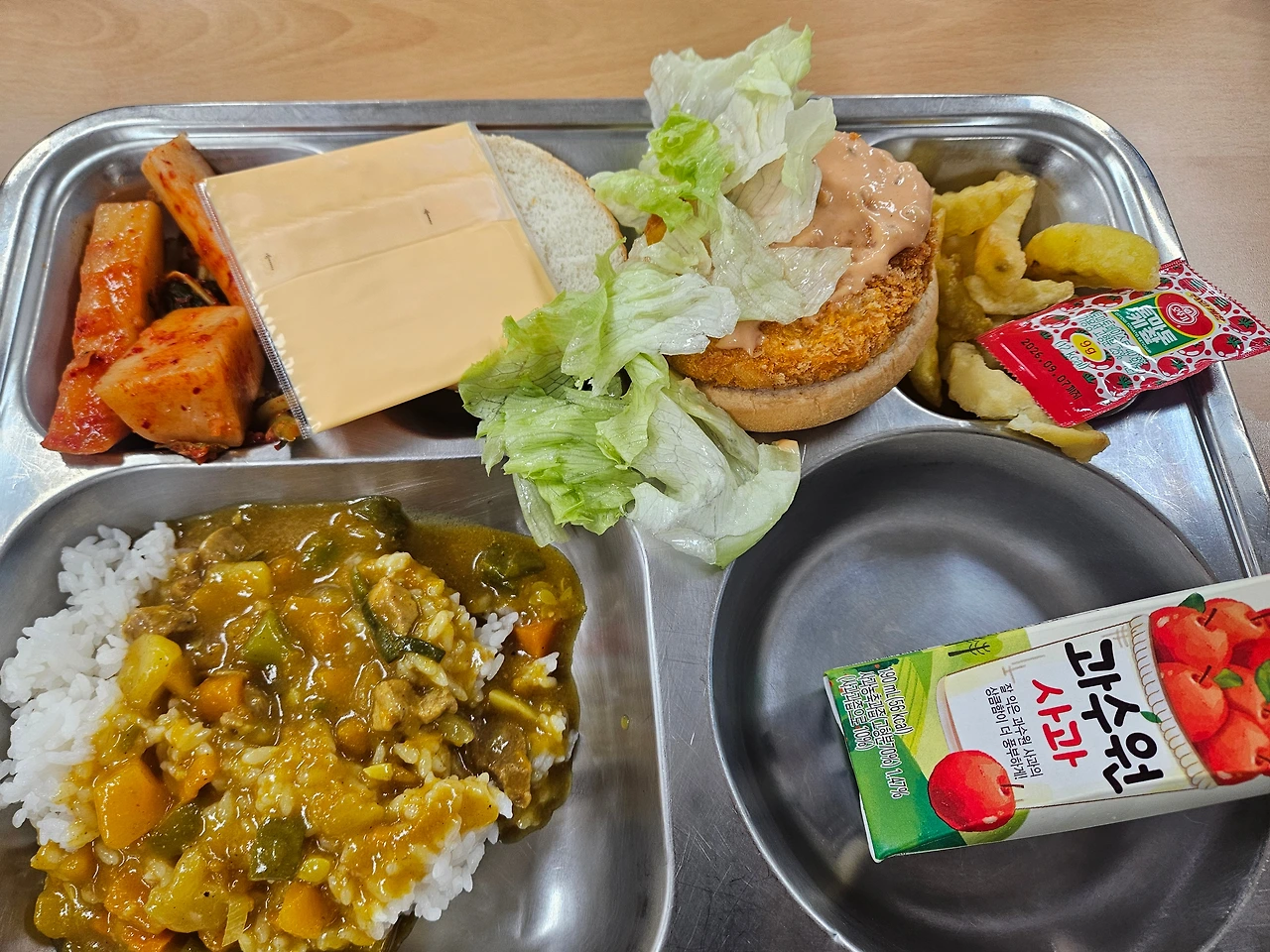 통새우버거와 카레가 나왔다. 최애 메뉴 중 하나라 좋았다.