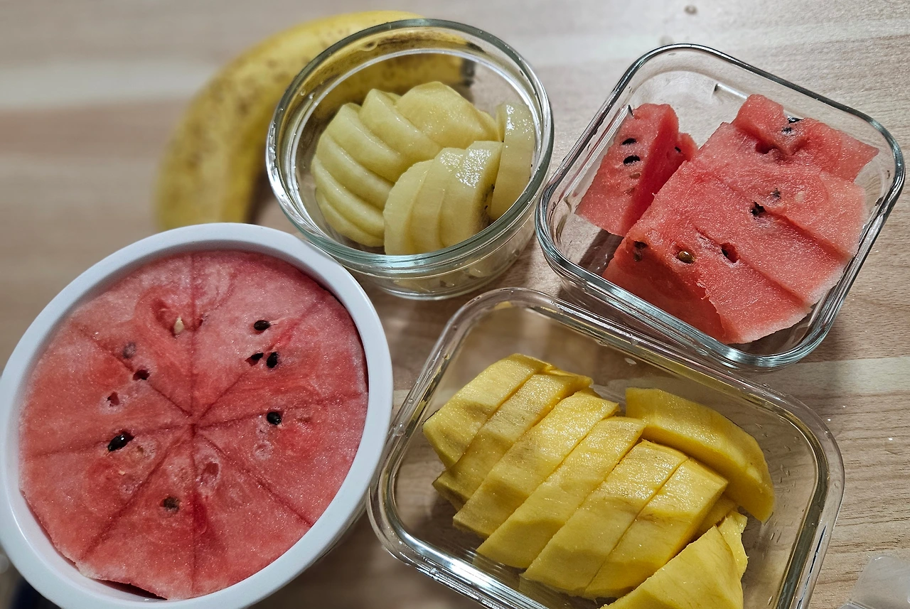담아둔 과일을 꺼내 먹으며