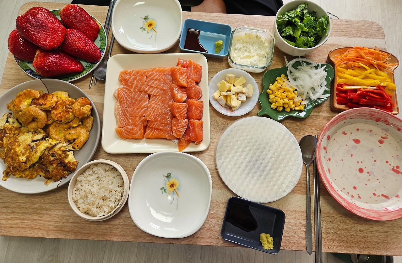 라이스페이퍼에 연어와 브리치즈, 야채를 넣어 싸먹었다. 소스는 급히 만들었는데 크림치즈에 잘게 썬 피클과 양파를 넣어 섞으니 제법 랜치소스 같았다.