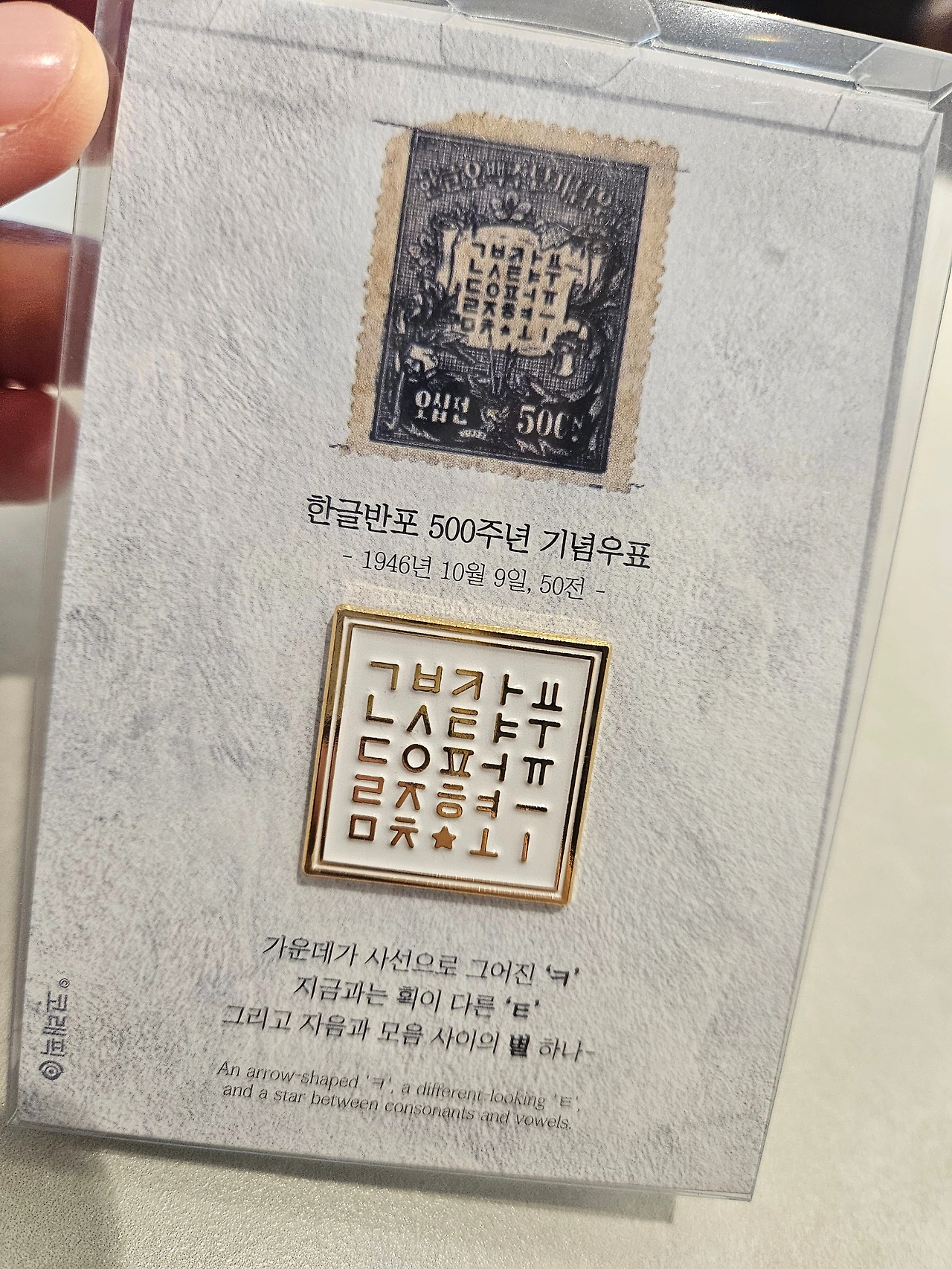 K언니랑 데이트하는 날이었는데 한글반포 기념우표 배지를 선물해주셨다. 야호!