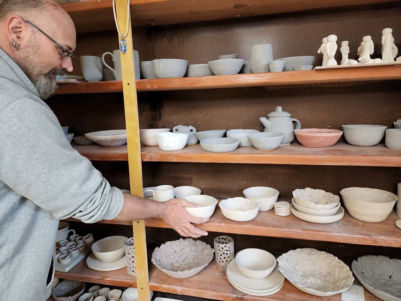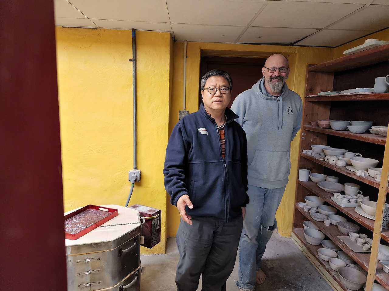자원봉사자와 막 만들어 낸 도자기류