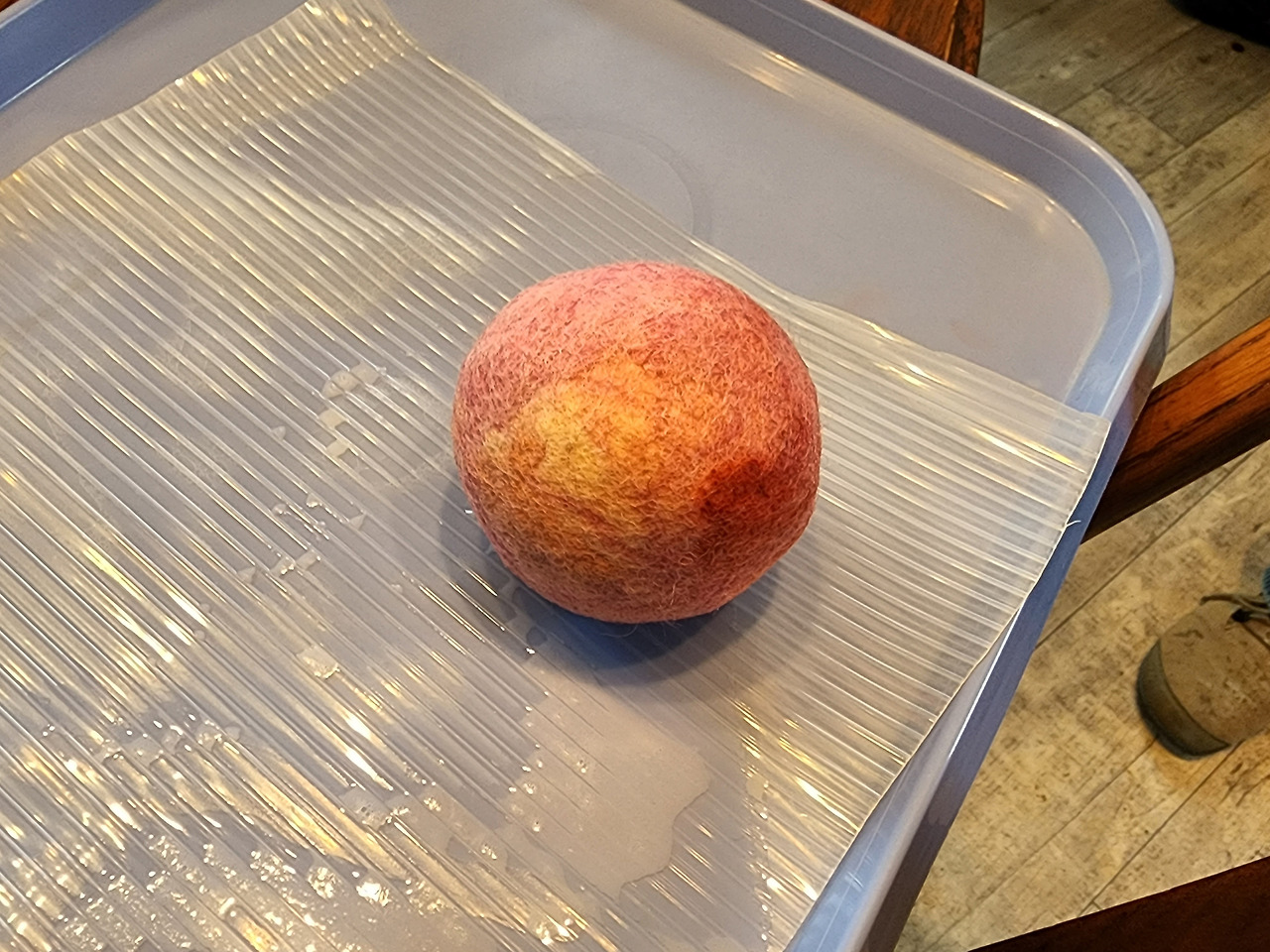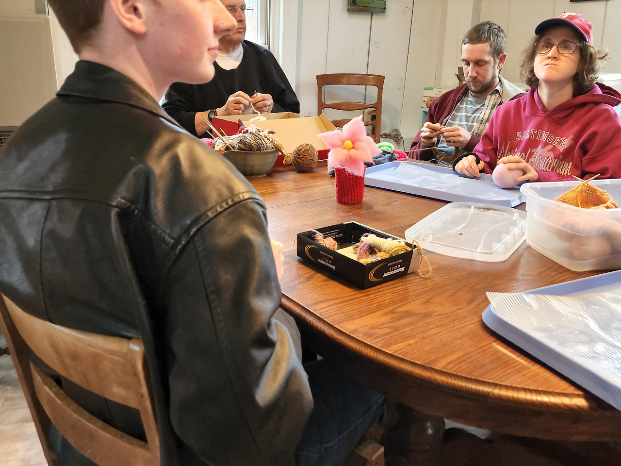 털로 만든 실공, 뜨게질 하는 아이들과 자원봉사자들, 그리고 그 실습장