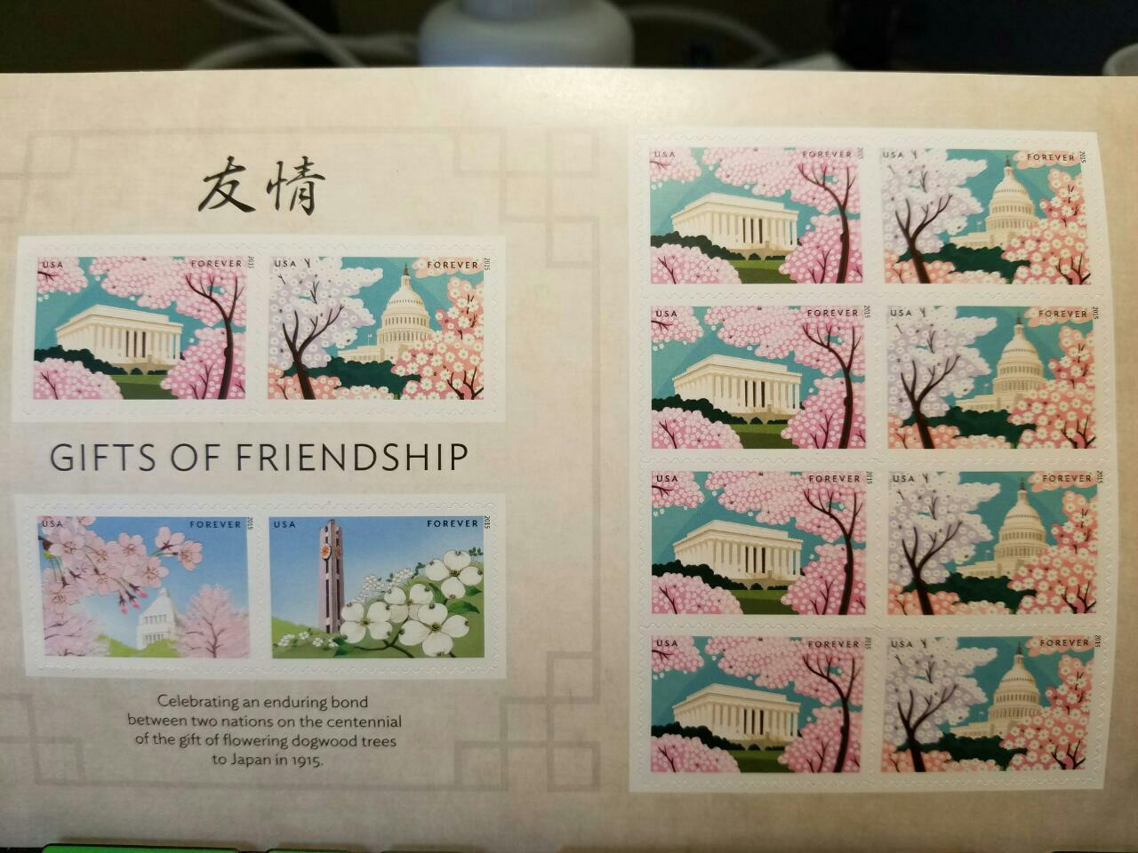 그런데 어떤 이유로 이 미국 우표에 "우정(友情)"이란 한자가 들어가 있을까 하는 호기심에 그 내용을 연방 우정국 인터넷으로 찾아봤더니, 1912년에 일본이 미국 워싱턴으로 보내진 3천여 그루의 벚꽃나무를 선물로 받은 답례로, 미국 정부가 1915년에 Dogwood(층층나무, 북미대륙이 원산지로 4 잎의 꽃이 오랫동안 펴 정원수로서 사랑받는 나무)를 홍색 40그루, 백색 20그루 이렇게 60그루를 일본으로 보냈다고 한다.