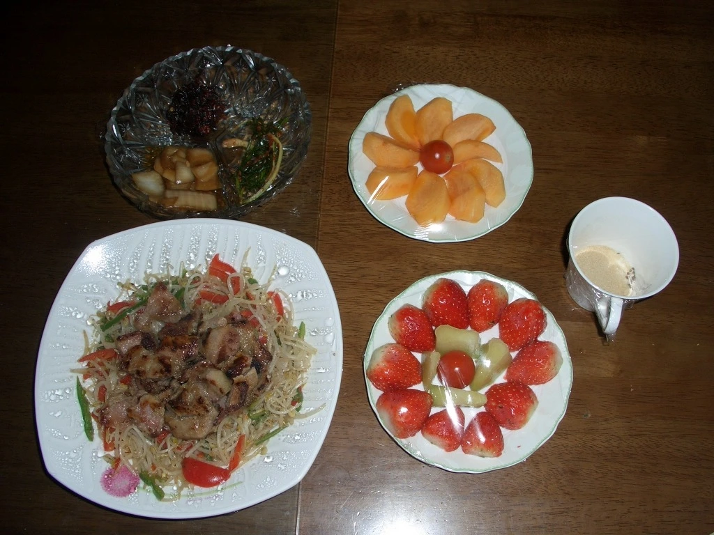 삶은 숙주 위에 돼지고기볶음을 올린 대 접시와 꼭지 뗀 딸기로 테두리를 두르고 멜론 슬라이스로 가운데를 장식한 접시, 팔 등분 한 감을 나선처럼 두르고 토마토를 중심에 넣은 접시, 그리고 밑반찬 세 개를 담은 접시였다.