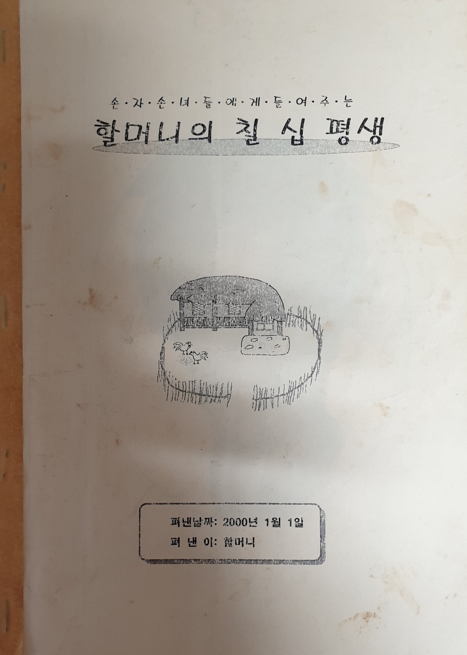 학교도 다니지 못하고 환갑이 다되어 한글을 배우고, 성경책과 불경 책을 읽으며 글을 익힌 할머니는 죽기 전 자신의 역사를 기록하셨다. 2000년 1월 1일 이 책을 손자 손녀들에게 만들어 주셨고, 21년이 지나 색 바랜 책 속엔 아직도 할머니의 한 맺힌 삶과 자식들을 걱정하는 마음이 고스란히 전해 온다.