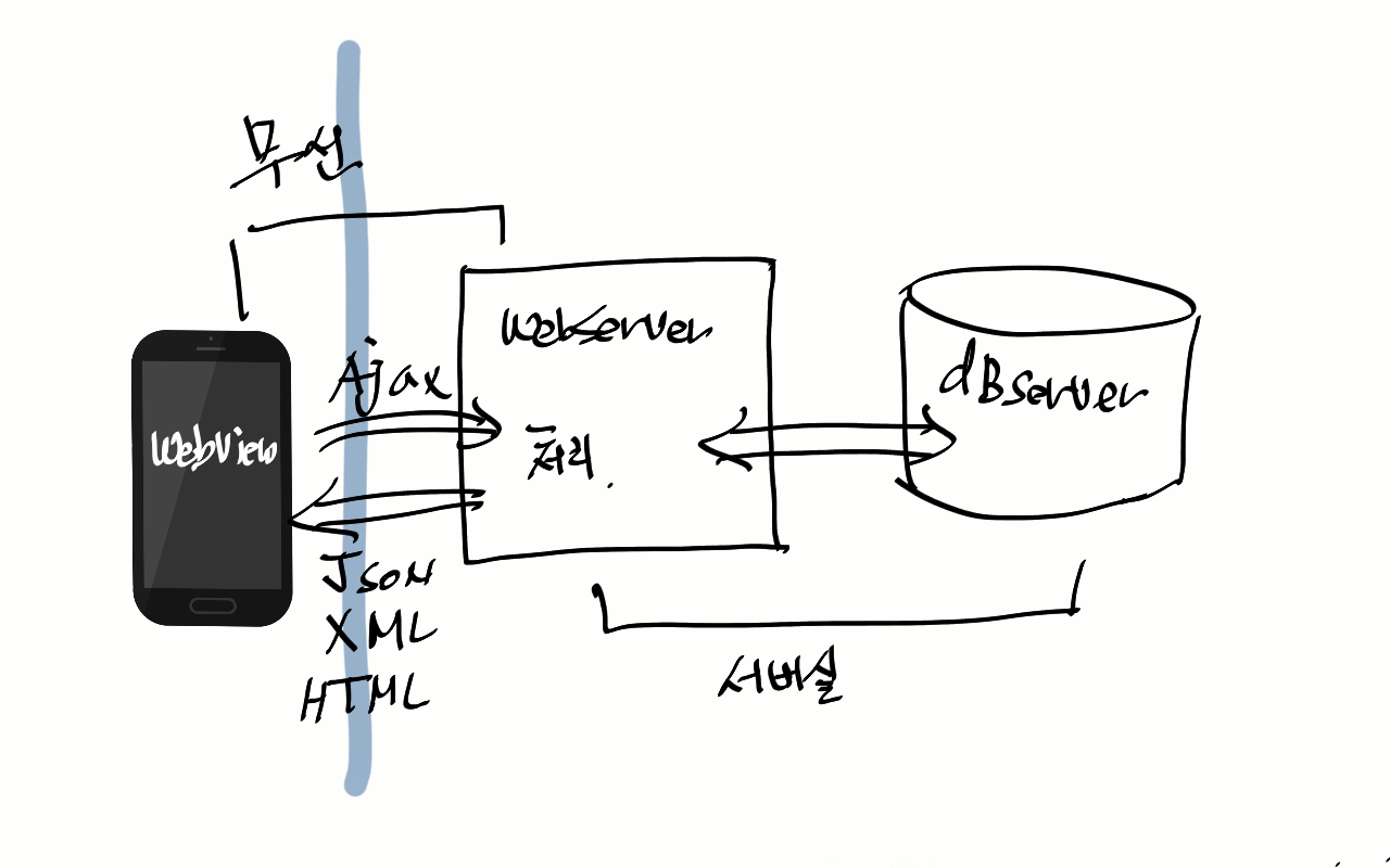 앱을 웹 브라우즈라 생각하면 쉽습니다. 단 db연결은 ajax로 처리해야 됩니다. 그리고 서버와 통신으로 돌아갑니다.