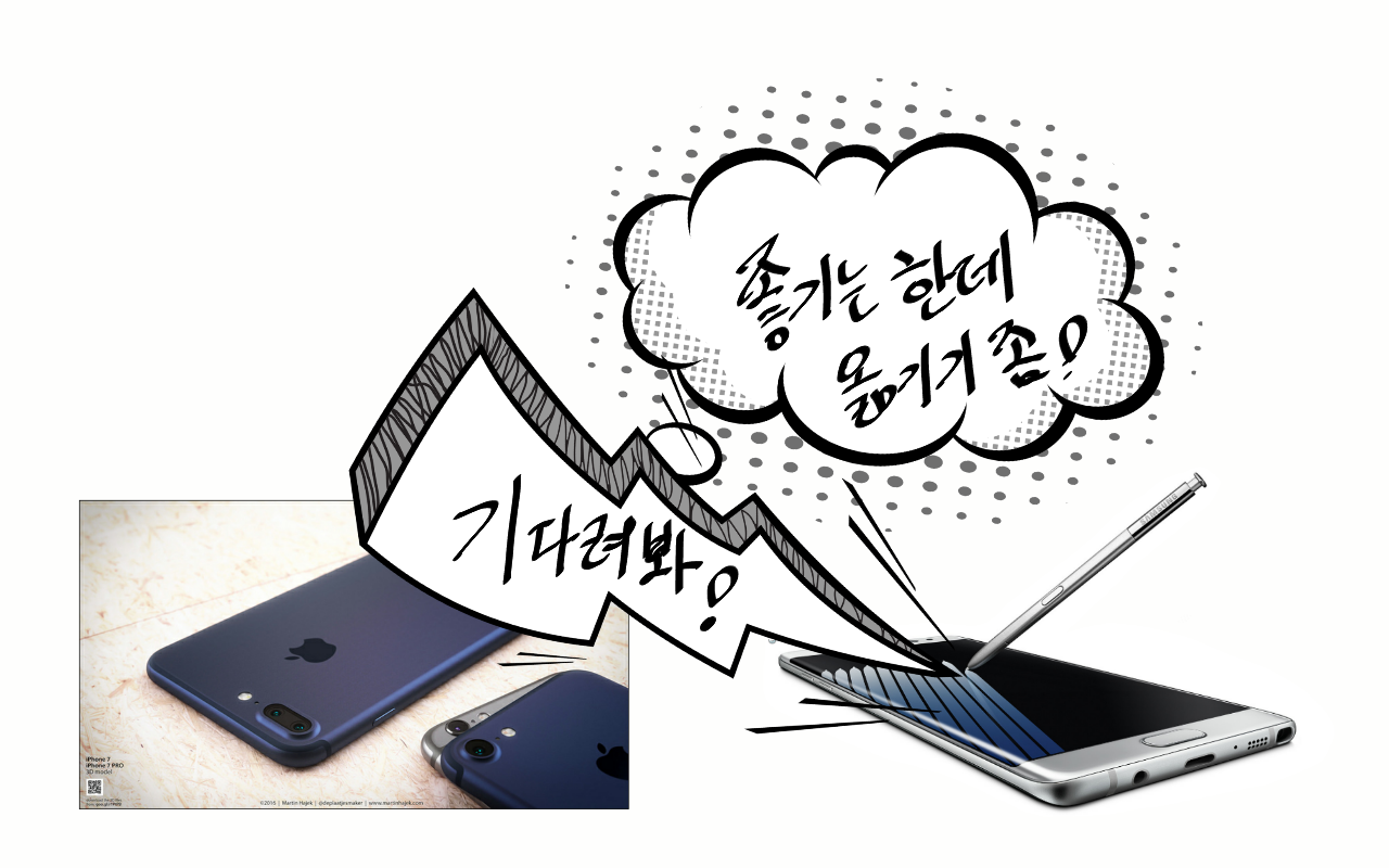 두 제품의 마니아도 다르고 엄연히 다른 카테고리입니다. 이 두 제품을 같이 보고 비교하는 것은 아쉬울 겁니다. 아이폰 7은 가지고 갈 수요를 가지고 간 것으로 보시면 되고 갤럭시 노트 7은 일부 아이폰 수요를 가지고 올 기회는 있었지만 그건 희망일 뿐 갤럭시 노트 7 때문에 아이폰 7의 인기가 폭발을 막지 못했다고 보기 힘듭니다.