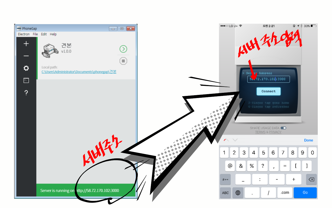 DESKTOP APP 의 서버 주소를 모바일 폰갭에 입력해주시면 됩니다.
