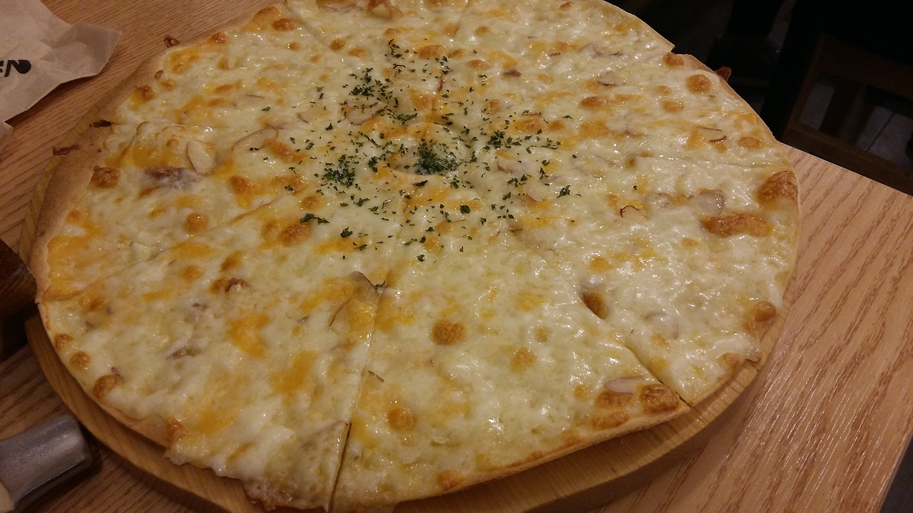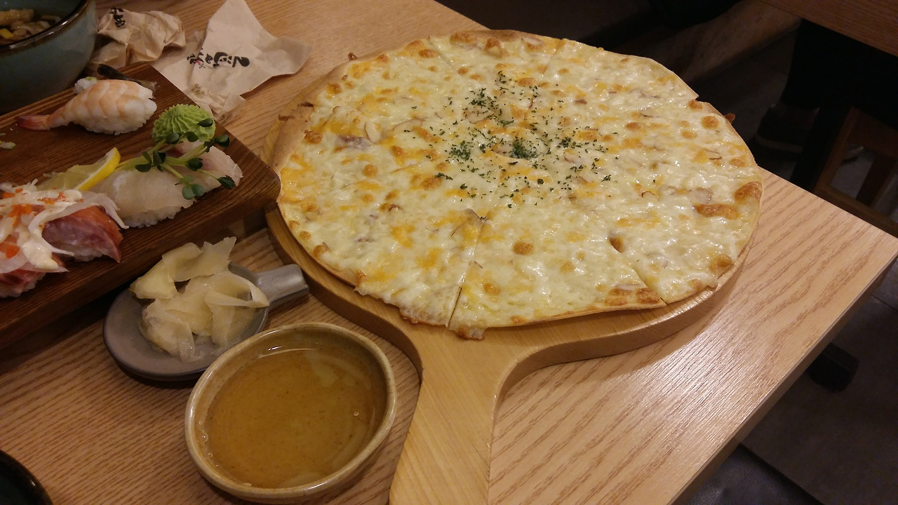저 초밥집에서 주는 피자 사진이다. 더 가까이서 찍었다. 이것도 어두운 것 빼고는 나온 것 같다.