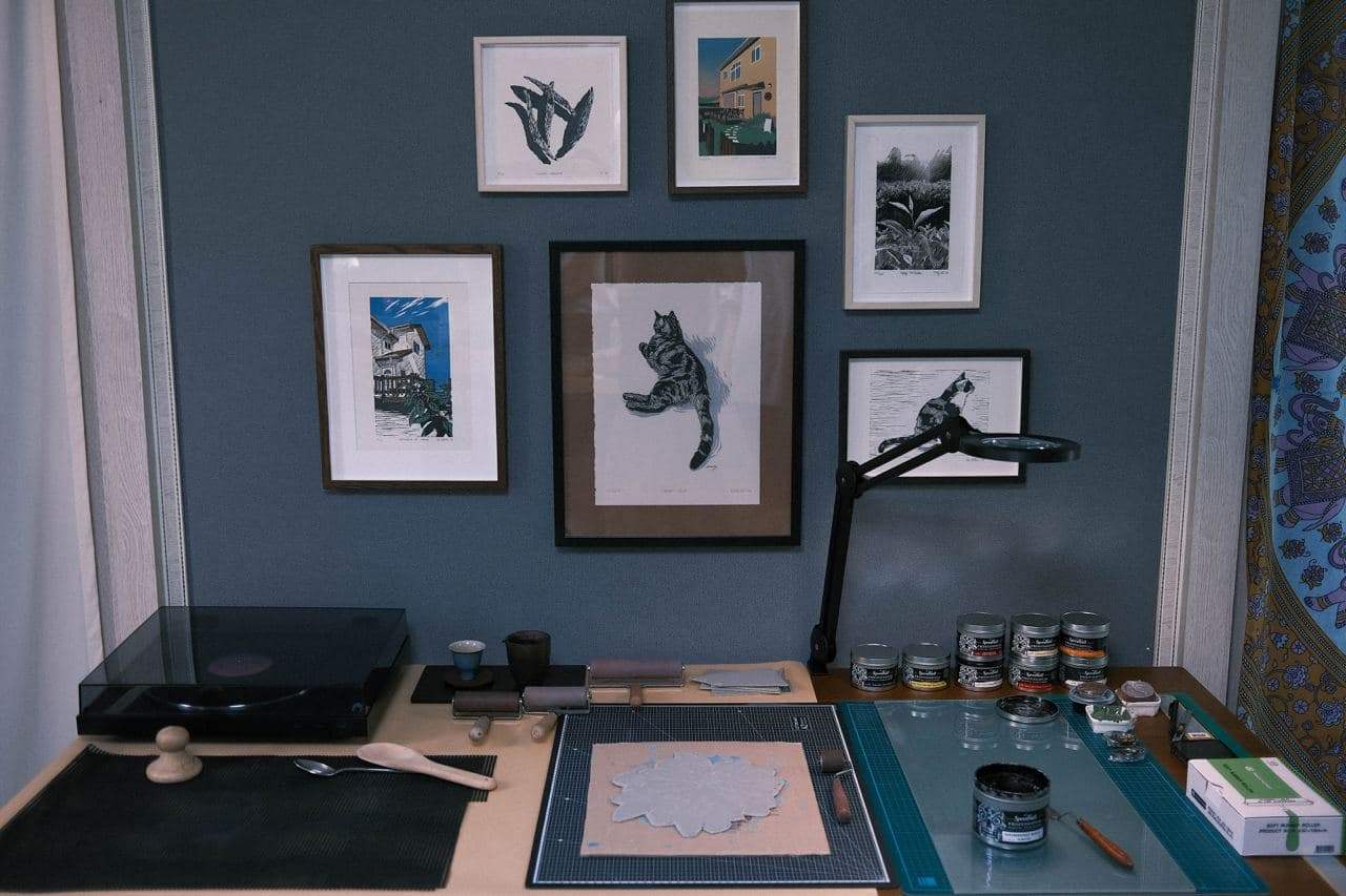 "그동안 오랜 시간 동안 디자이너와 마케터로 일했고, 지금은 판화 작업자로 새로운 2막을 시작하게 되면서 하는 일은 바뀌었을지언정 '영감'이라는 것은 늘 가장 쉬우면서도 어려운 단어로 저에게 인식되고 있어요. 다들 비슷하겠지만 어쩔 땐 번개같이 빠르게 다가오고 어쩔 땐 깊은 심연에서 떠오를 줄 모르는 것이 바로 영감이거니와, 제가 그동안 했던 모든 일에 대해서 반드시 필요한 무언가였으니까요. 판화 소재에 대한 영감은 아직 시작한 지 얼마 되지 않아서 그런지 다양한 부분에서 자주 얻게 되는데요. 최근에는 주로 일상의 순간에서 영감을 많이 얻는 것 같아요. 내가 좋아하는 공간이나 풍경, 같이 사는 고양이 등 제 눈에 아름답다고 느껴지는 것은 전부 다 소재로써 한 번쯤은 고민이 되는 것 같아요. 특히 가장 많은 시간을 함께하는 파트너인 장이에게서 영감을 많이 얻습니다. 좋은 조언을 많이 해 주기도 하고, 소재에 대한 아이디어를 많이 제공해 주기도 합니다."
