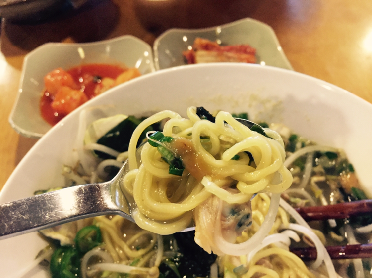 라면 생면과 바지락 육수, 적당히 데쳐진 숙주와 구운 반숙 계란, 그리고 건호박과 김까지!! 어느 것 하나 따로 놀지 않으면서 본연의 맛을 낸다. 특히 건호박 아이디어가 참 좋았는데 뜨거운 국수 안에서 흐물흐물해지는 호박보다 보기도 좋고 식감도 좋았다. 구운 것으로 추정되는 반숙 계란은 짭조름한 맛 때문에 오물오물 오래 씹어 먹고 싶어 진다.