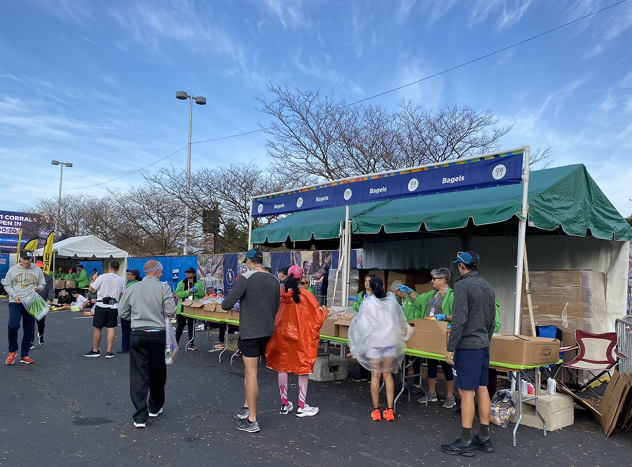 새벽 6시에 자원봉사자들은 출석체크를 하고 녹색 점퍼와 목걸이를 받는다. 같은 분야의 일을 지원한 사람들끼리 모여 주의사항을 듣고 각 Village 별로 배치가 된다. 3개의 빌리지가 있는데 나와 남편은 Green Village. 색깔로 구분되는 village 3개 그 안에 시간대별로 다르게 출발하는 wave 다섯 그룹. 이 많은 인파는 자신이 받은 빕에 표시된 색깔과 출발시간을 기억하고 정해진 곳에서(물론 자유롭게 돌아다닐 수 있다) 대회를 기다린다. 일반 러너들이 처음 출발하는 wave 1 그룹은 9시 10분. 출발까지 선수들은 몸을 따뜻이 해야 하기 때문에 수거할 옷이 나오지 않아 3시간 정도 시간적으로 여유가 있었다. 덕분에 행사장 이곳저곳을 구경할 수 있었고, 대회에서 준비해준 던킨 커피와 베이글, 에너지 바를 배부르게 먹으면서 여유 있게 대회를 관망할 수 있었다.