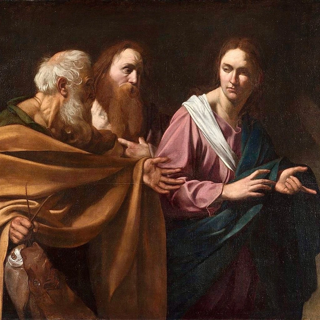 바로크 시대 대표화가 카라바지오의 그림을 볼까요? 명암법의 대가답게 등장인물의 얼굴로 비치는 빛이 그림에서 긴장감을 자아내고 있는 것 같아요. 예수님의 얼굴에서 확고함이 느껴집니다. '나 너희들 선택한 거 절대 후회 안 하거든? 어서 따라와!'라고 말하는 듯한 표정입니다. 베드로의 오른손은 예수님께 펼쳐져 있지만 아직 왼손에는 물고기를 놓지 못하고 있네요. 물고기를 내려놓기 전에 무언가 여쭤보려고 하는 듯해요.