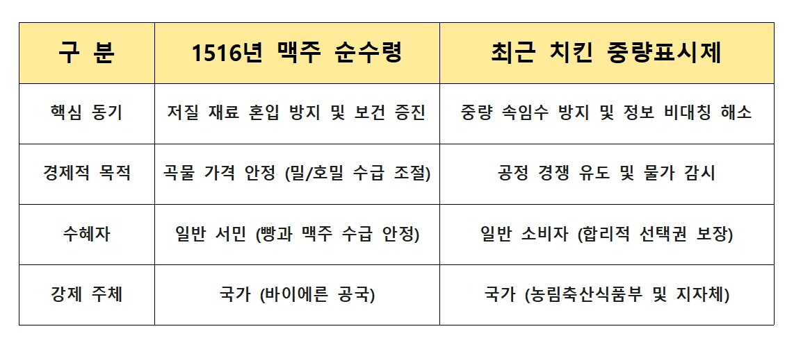 1516년 공포된 바이에른의 '맥주 순수령(Reinheitsgebot)'과 최근 논의되고 시행된 대한민국의 '치킨 중량표시제'는 얼핏 보기에 시공간적 간극이 크다. 그러나 그 내면을 들여다보면 소비자 보호, 공정 거래의 확립, 그리고 품질의 표준화라는 국가적 열망이 투영되어 있다는 점에서 놀라운 평행이론을 보여준다.