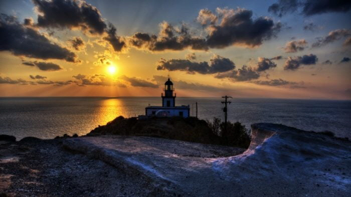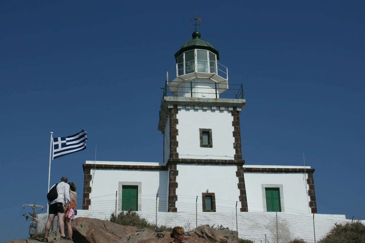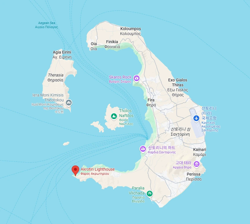 여행자들은 이아 마을의 석양을 최고로 치고, 석양때 이아 마을 뷰포인트에 가면 발 디딜틈도 없다. 하지만 섬의 정반대 지역인 아크로티리쪽 등대에 석양을 보러 가는 사람은 많지 않다.