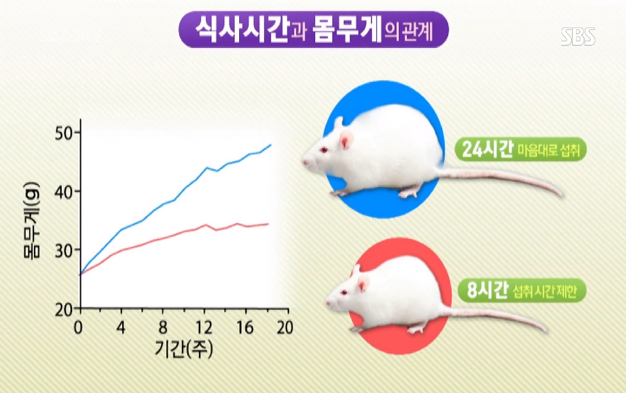 간헐적 단식. 결론부터 말하면 같은 양을 먹어도 공복시간을 길게 유지하면 살이 덜 찌게 된다. 생쥐 실험에서도 같은 양의 음식을 먹어도 8시간 동안만 섭취(16시간 공복)하면 24시간 조금씩 나눠먹었을 때 체중이 많이 증가하게 된다. 즉, 자기 직전에 작은 빵 1개를 먹어도 공복시간을 깨버리기 때문에 체중 증가에 큰 영향을 끼칠 수 있는 것이다.
