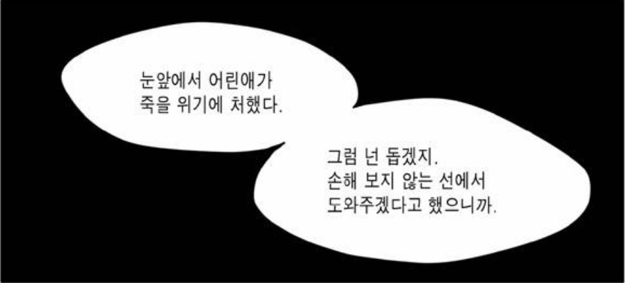 아이를 구하는 이유는 나의 손해가 매우 적고, 아이를 구하는 게 '선한 일'이라는 인식 때문일 것이다. 그럼 타인의 생명을 구하는 '선한 일'에 우리는 어느 정도 수고와 희생까지 감수할 수 있을까? 흔히 생명은 돈으로 환산할 수 없는 고귀한 가치라고 이야기 하지만, 현실에서는 돈이 생명보다 우선시 된다고 느끼는 많은 상황을 만나게 된다.
