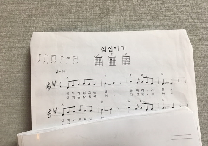 어설픈 폼으로 기타를 무릎 위에 올려놓고 왼손으로 유일하게 기억하고 있는 G코드를 슬며시 짚어봤다. 혹시 기타를 배운 적이 있냐는 선생님의 질문에 8년 전 몇 개월 깔짝댄 게 전부이니 그냥 처음부터 알려달라고 말했다. 첫 곡은 A, E, D코드가 반복되는 '섬집아기.' 분명 다 아는 음, 예전에 배웠던 코드인데도 내 손가락은 마치 슬로우가 걸린 듯 멍청하게 움직였다. 악보와 기타 위를 두 눈과 손가락으로 정신 없이 훑는 내 모습이 왠지 웃겨서 수업 중간중간 나도 모르게 피식 비웃음이 새어나왔다. 그렇게 악보 속 음표와 기타 줄 사이를 허둥지둥 뛰어다니다가 첫 수업이 끝났다.